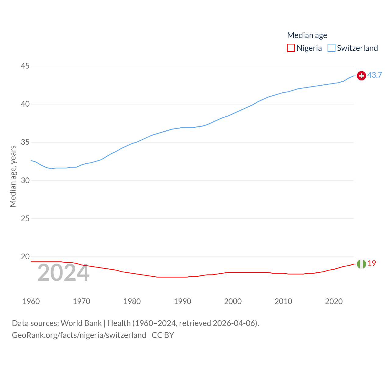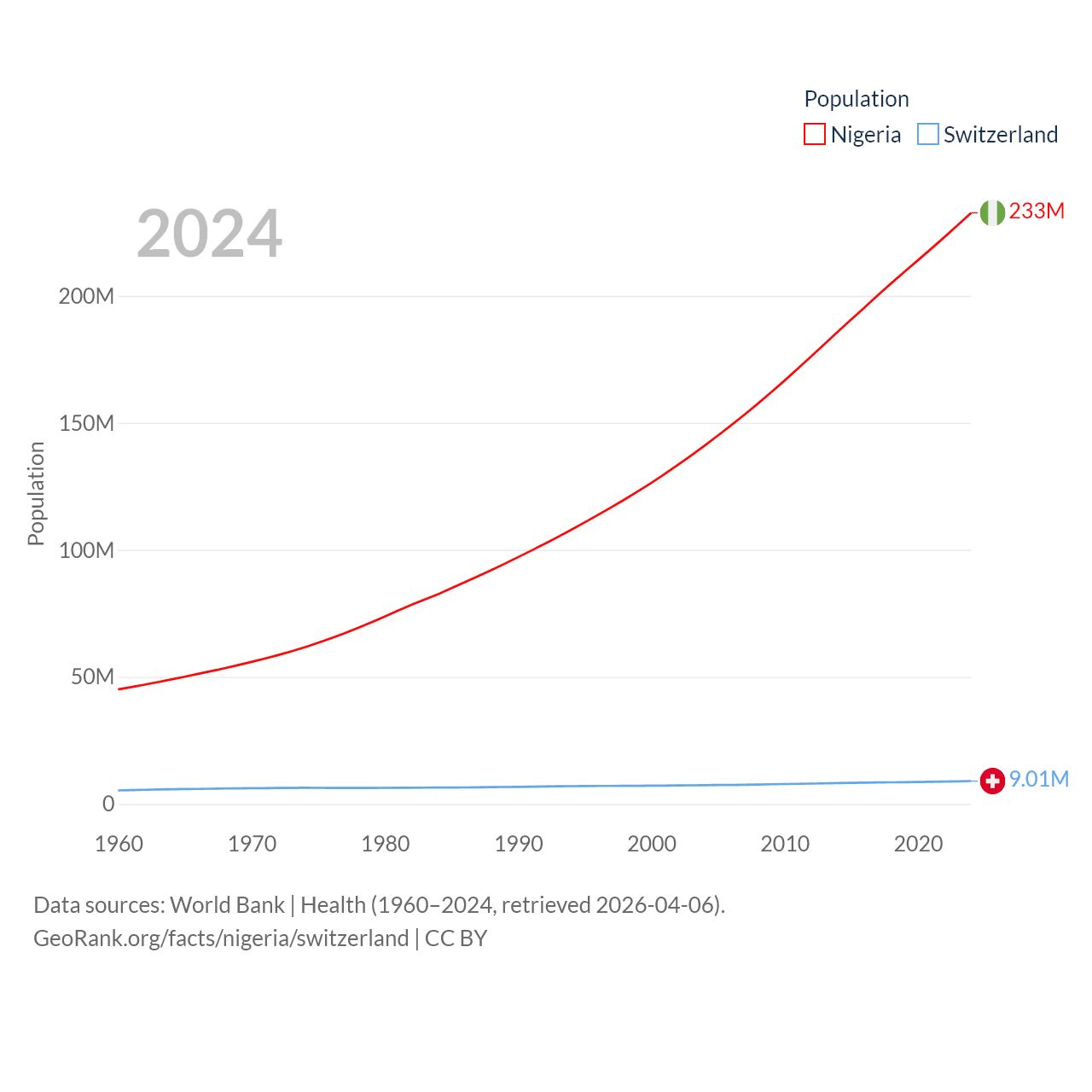 Nigeria has a population of 233M (ranked 6/197), compared with 9.01M in Switzerland (ranked 101/197). Nigeria's land area is 351,650 sq mi versus 15,255 sq mi for Switzerland (ranked 30th vs. 131st).
