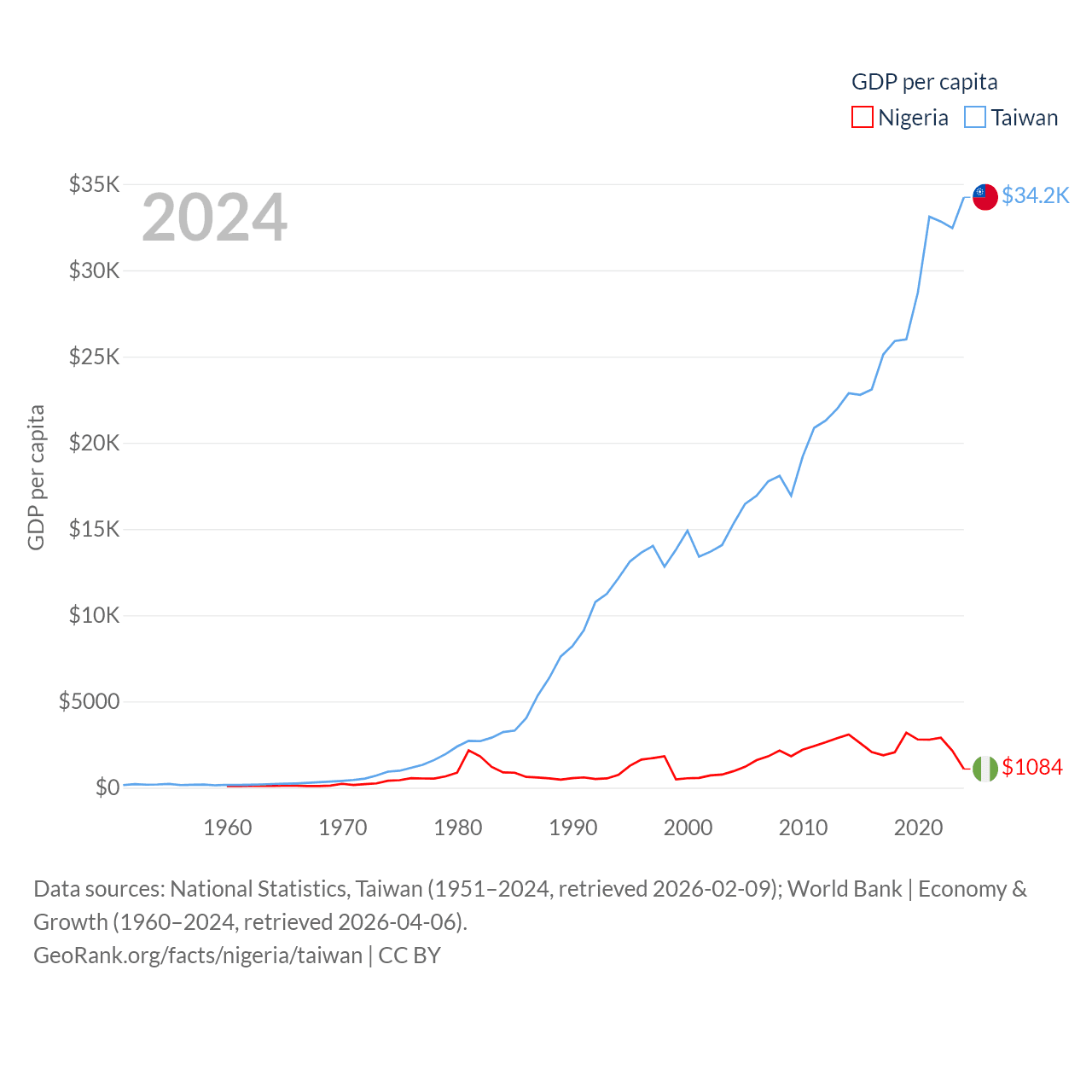 By GDP, Nigeria ranks 54/197 ($252B) and Taiwan ranks 22/197 ($802B). By GDP per capita, Nigeria ranks 174/197 ($1,084), while Taiwan ranks 35/197 ($34,238).
