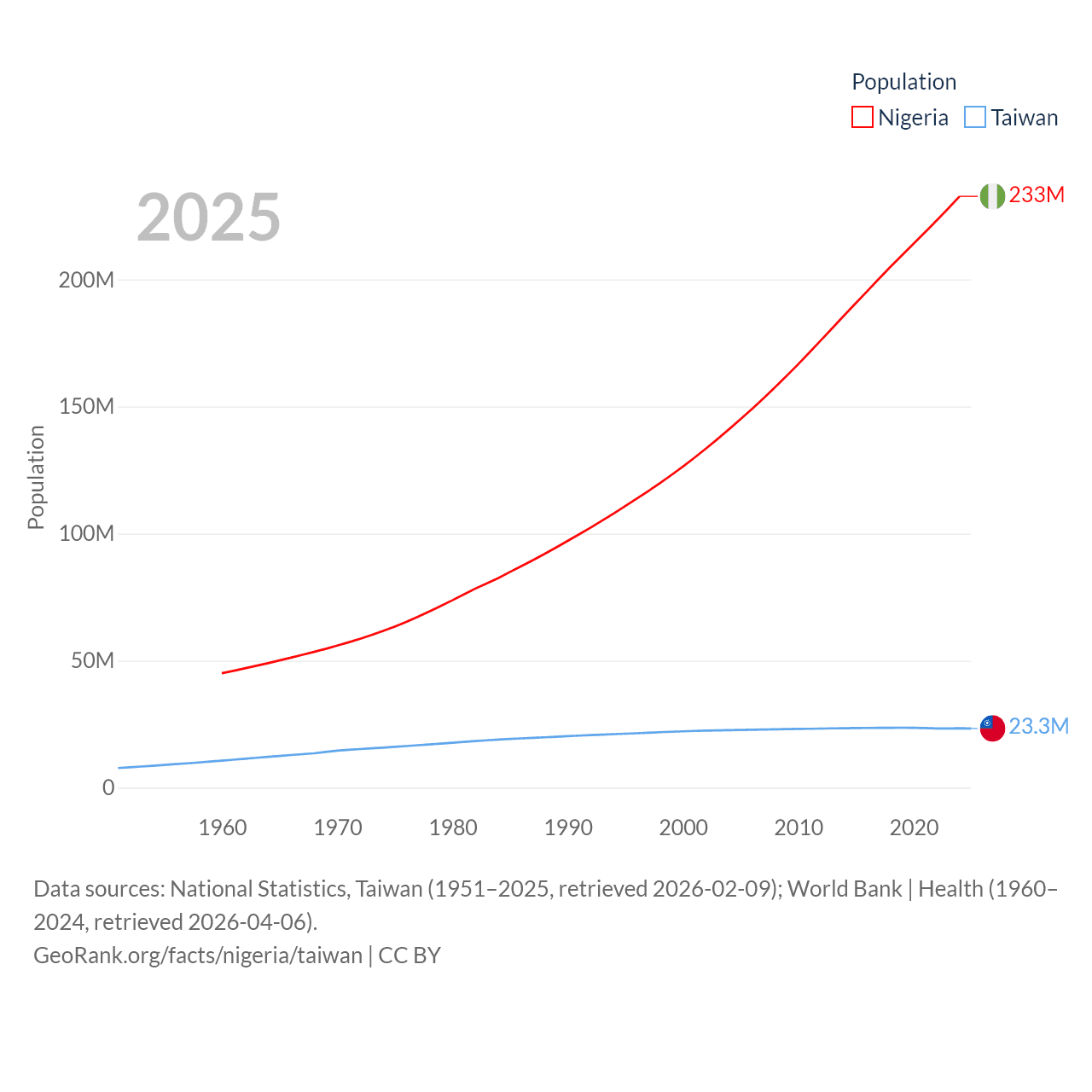 Nigeria has a population of 233M (ranked 6/197), compared with 23.3M in Taiwan (ranked 60/197). Nigeria's land area is 351,650 sq mi versus 13,976 sq mi for Taiwan (ranked 30th vs. 133rd).