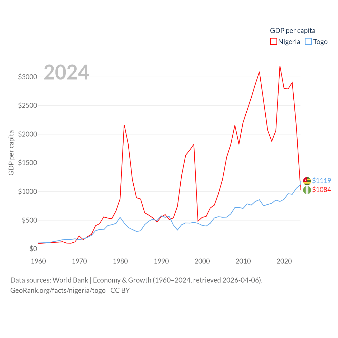 By GDP, Nigeria ranks 54/197 ($252B) and Togo ranks 154/197 ($10.7B). By GDP per capita, Nigeria ranks 174/197 ($1,084), while Togo ranks 172/197 ($1,119).