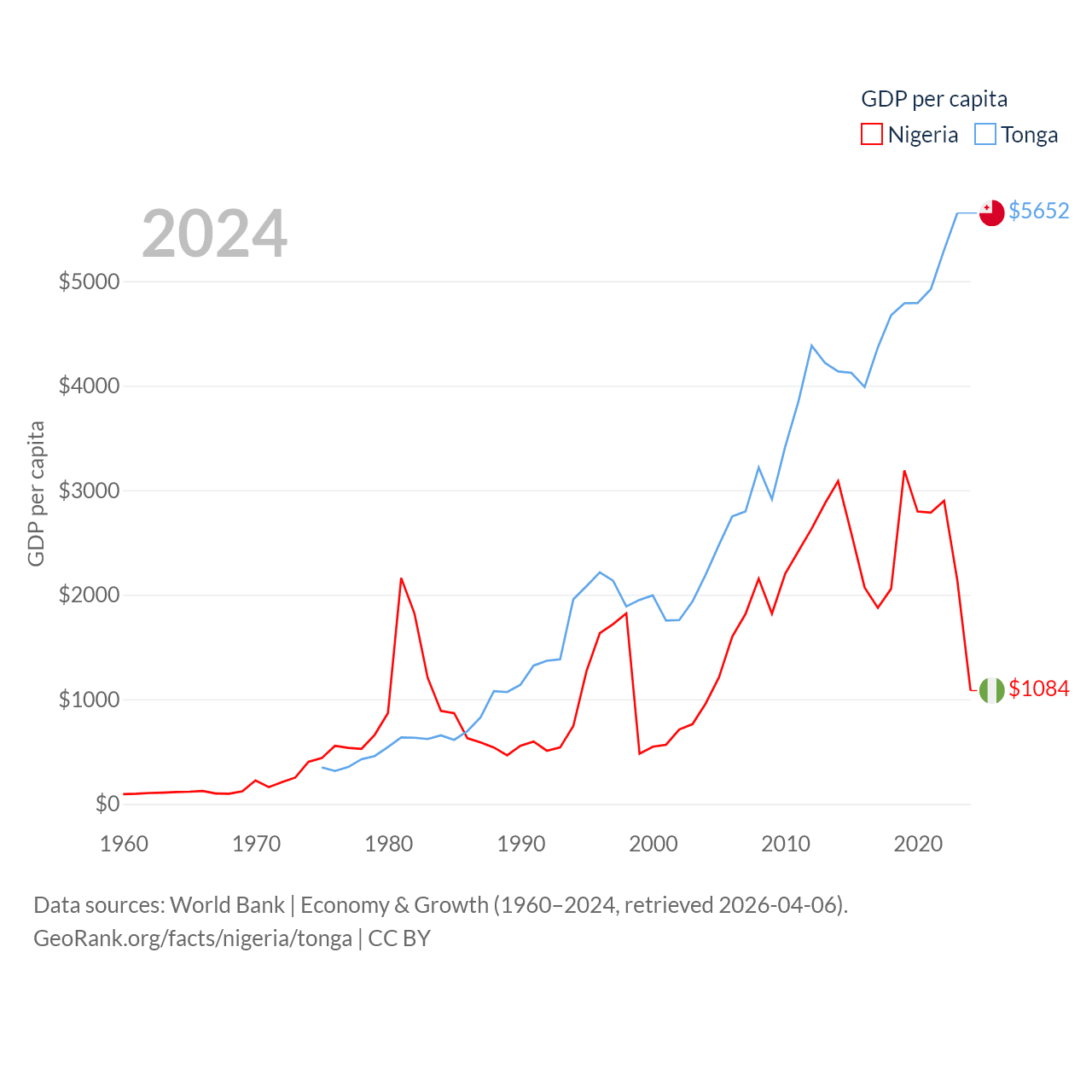 By GDP, Nigeria ranks 54/197 ($252B) and Tonga ranks 191/197 ($591M). By GDP per capita, Nigeria ranks 174/197 ($1,084), while Tonga ranks 115/197 ($5,652).
