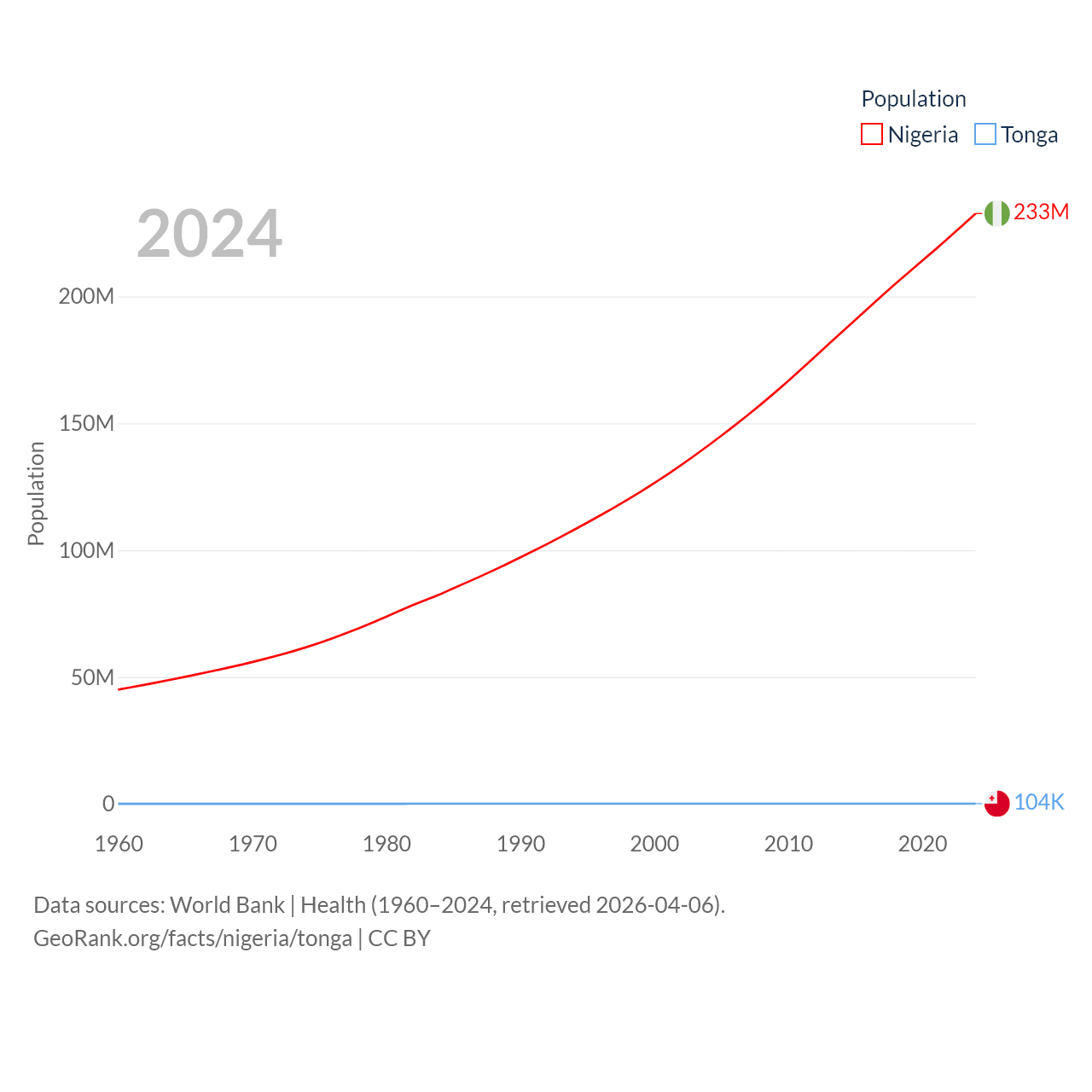 Nigeria has a population of 233M (ranked 6/197), compared with 104K in Tonga (ranked 183/197). Nigeria's land area is 351,650 sq mi versus 278 sq mi for Tonga (ranked 30th vs. 176th).