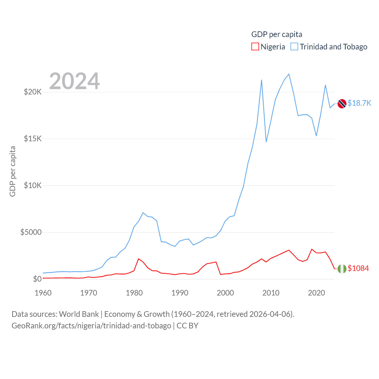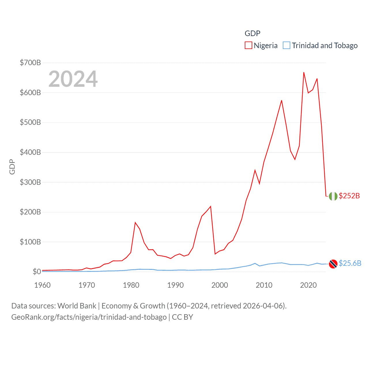 By GDP, Nigeria ranks 54/197 ($252B) and Trinidad and Tobago ranks 115/197 ($25.6B). By GDP per capita, Nigeria ranks 174/197 ($1,084), while Trinidad and Tobago ranks 61/197 ($18,733).