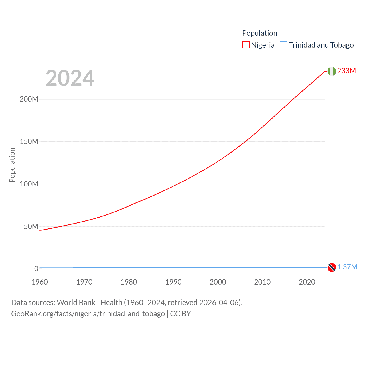 Nigeria has a population of 233M (ranked 6/197), compared with 1.37M in Trinidad and Tobago (ranked 154/197). Nigeria's land area is 351,650 sq mi versus 1,981 sq mi for Trinidad and Tobago (ranked 30th vs. 166th).