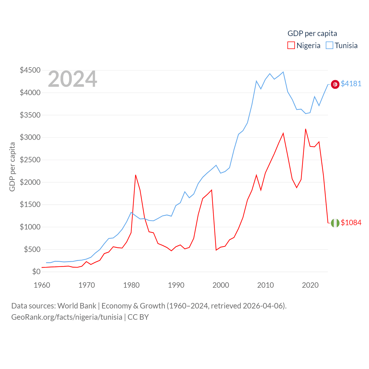 By GDP, Nigeria ranks 54/197 ($252B) and Tunisia ranks 93/197 ($51.3B). By GDP per capita, Nigeria ranks 174/197 ($1,084), while Tunisia ranks 129/197 ($4,181).