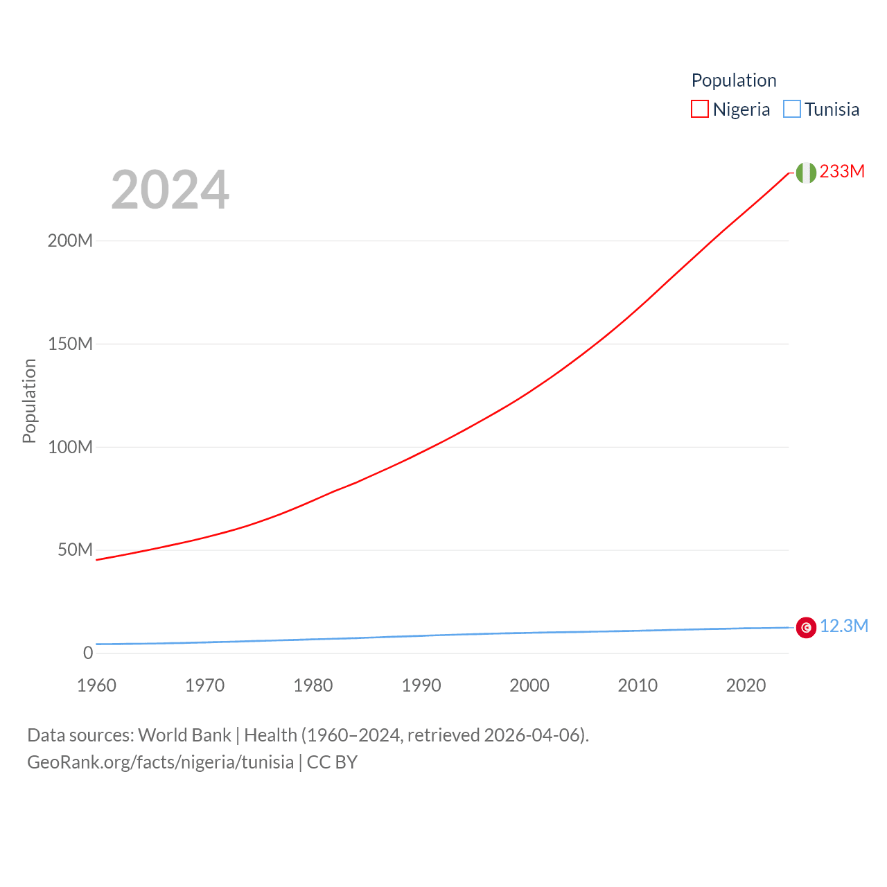 Nigeria has a population of 233M (ranked 6/197), compared with 12.3M in Tunisia (ranked 80/197). Nigeria's land area is 351,650 sq mi versus 59,985 sq mi for Tunisia (ranked 30th vs. 91st).