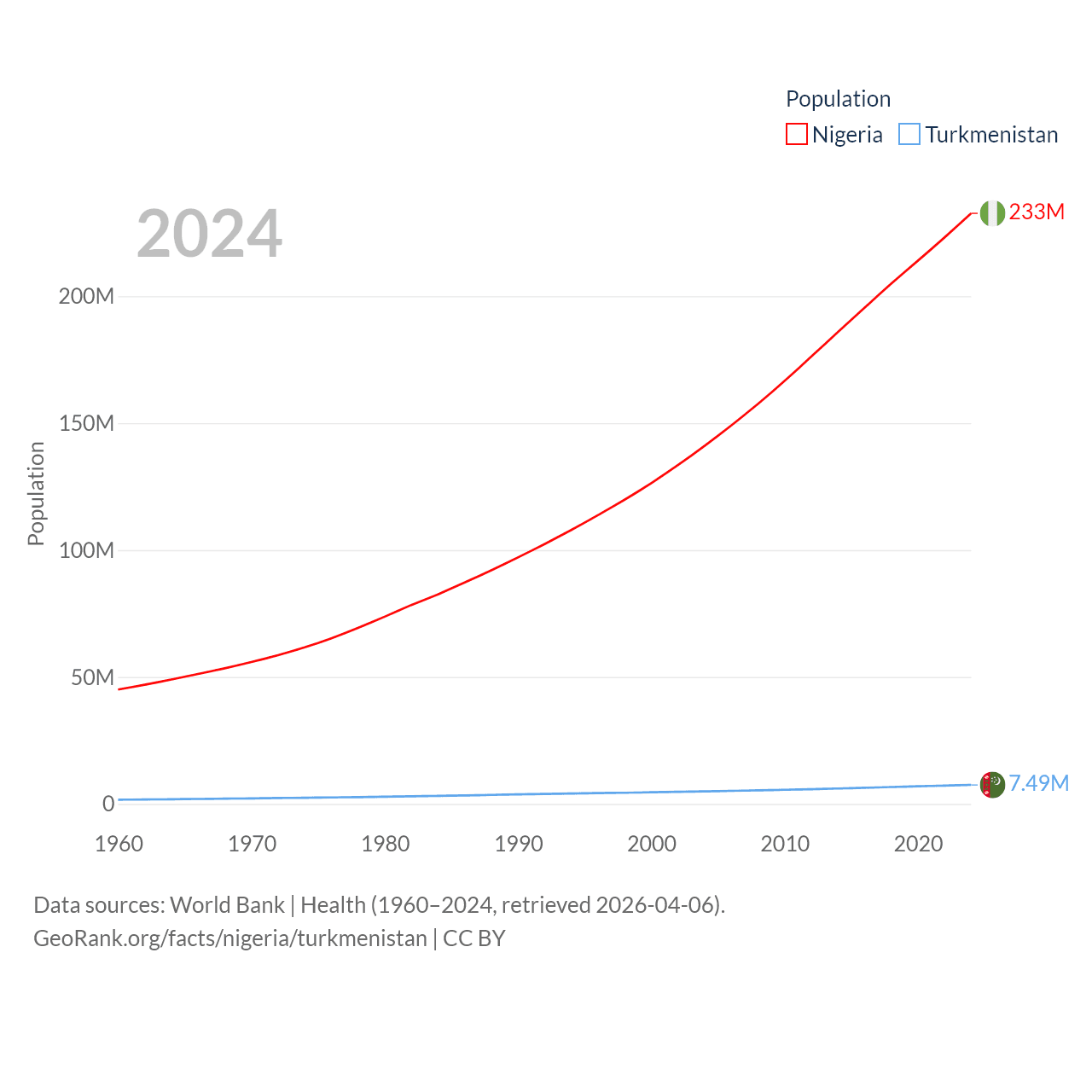 Nigeria has a population of 233M (ranked 6/197), compared with 7.49M in Turkmenistan (ranked 104/197). Nigeria's land area is 351,650 sq mi versus 181,441 sq mi for Turkmenistan (ranked 30th vs. 53rd).