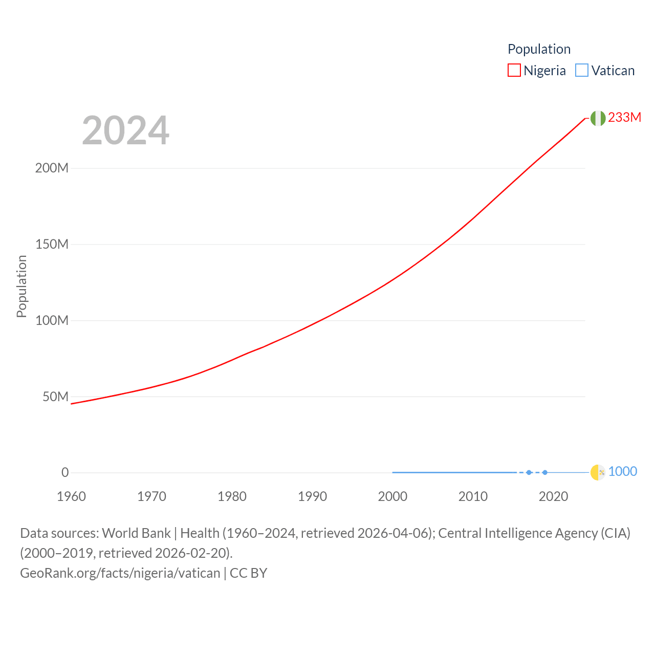 Nigeria has a population of 233M (ranked 6/197), compared with 1K in The Vatican (ranked 197/197). Nigeria's land area is 351,650 sq mi versus 0.17 sq mi for The Vatican (ranked 30th vs. 197th).