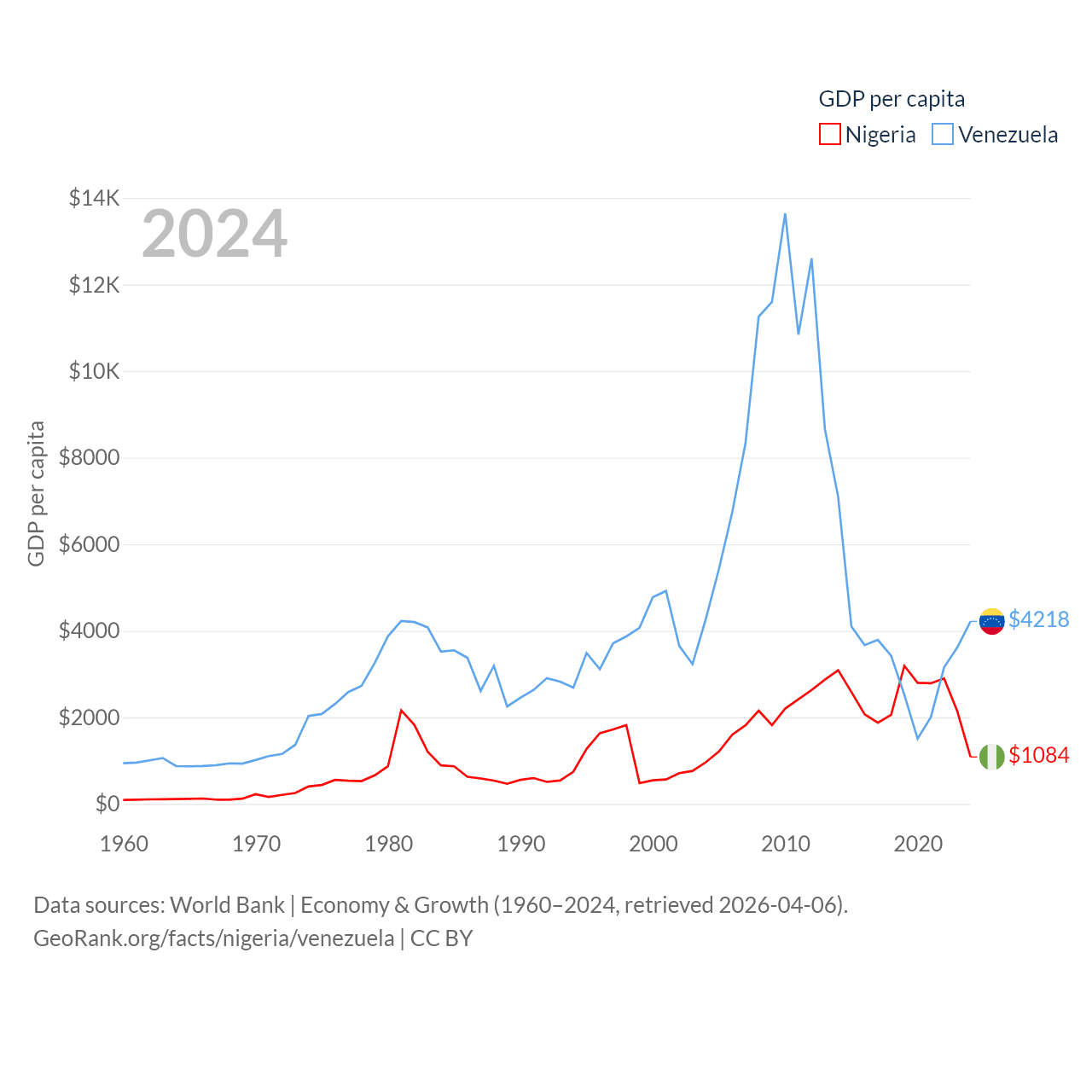 By GDP, Nigeria ranks 54/197 ($252B) and Venezuela ranks 65/197 ($120B). By GDP per capita, Nigeria ranks 174/197 ($1,084), while Venezuela ranks 128/197 ($4,218).