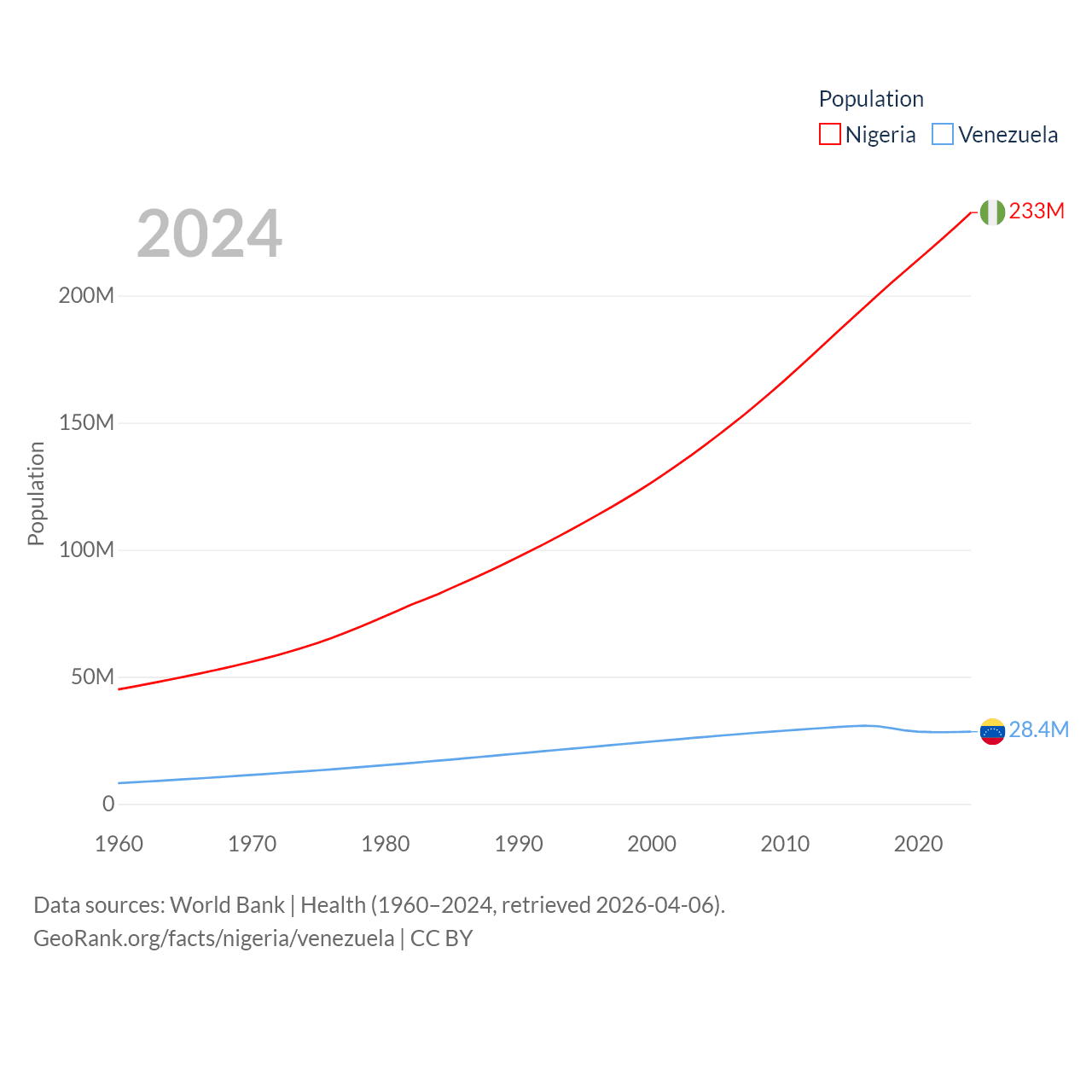 Nigeria has a population of 233M (ranked 6/197), compared with 28.4M in Venezuela (ranked 53/197). Nigeria's land area is 351,650 sq mi versus 340,561 sq mi for Venezuela (ranked 30th vs. 32nd).
