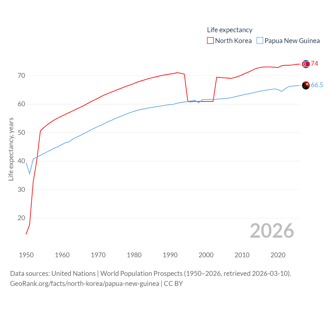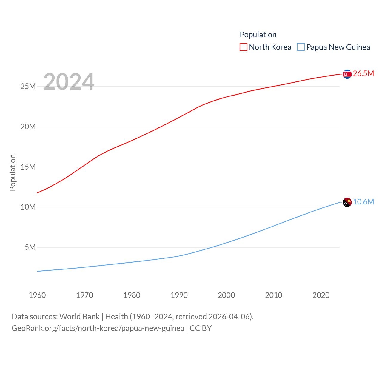 North Korea has a population of 26.5M (ranked 56/197), compared with 10.6M in Papua New Guinea (ranked 92/197). North Korea's land area is 46,491 sq mi versus 174,850 sq mi for Papua New Guinea (ranked 97th vs. 54th).