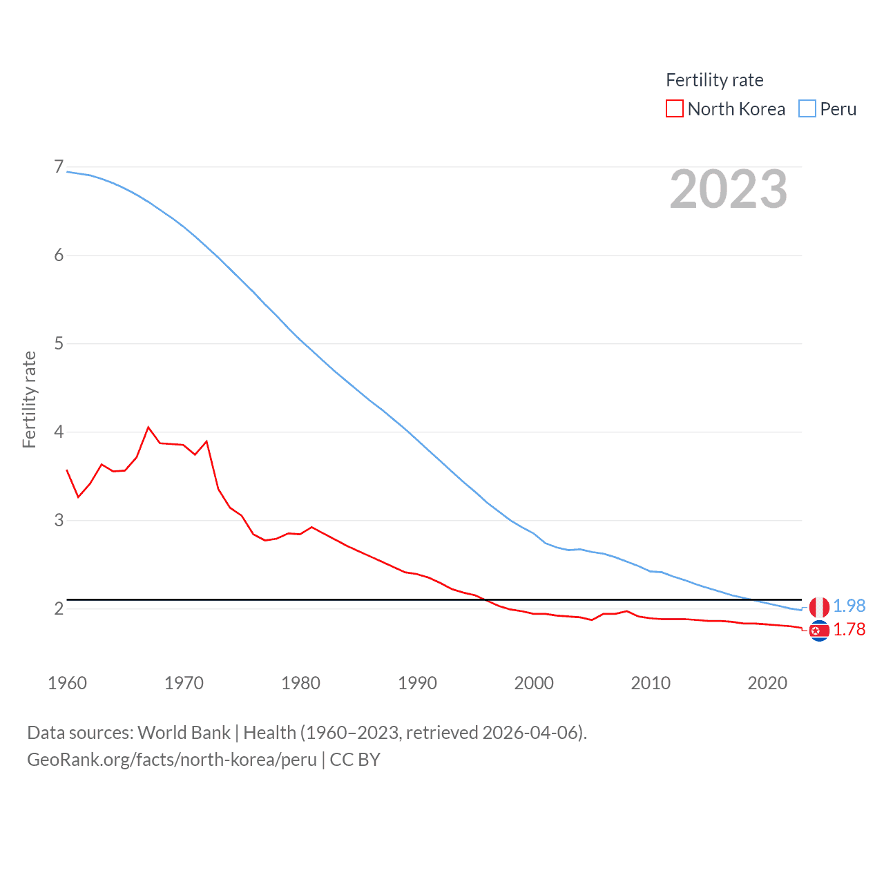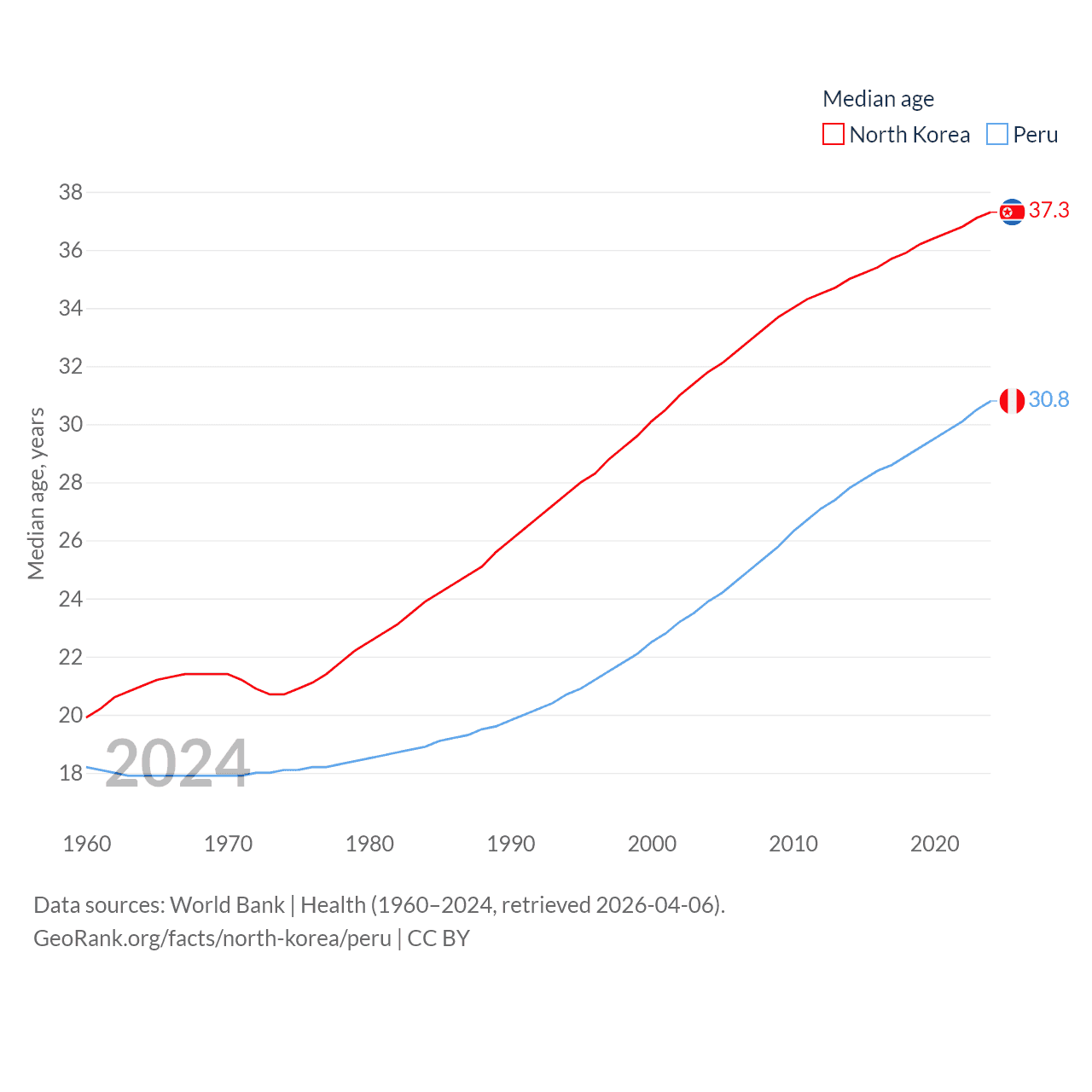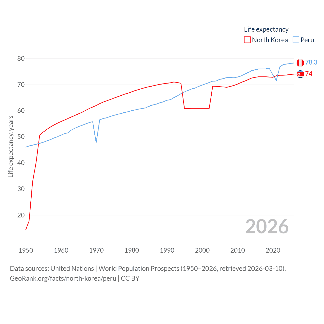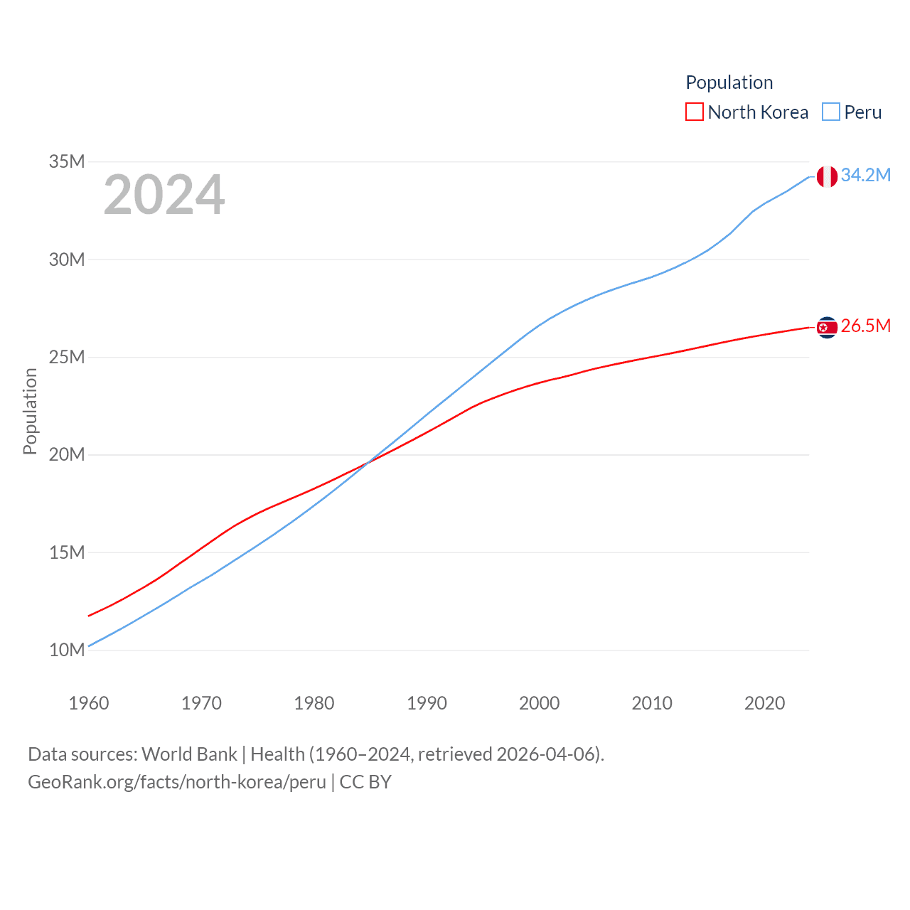 North Korea has a population of 26.5M (ranked 56/197), compared with 34.2M in Peru (ranked 48/197). North Korea's land area is 46,491 sq mi versus 494,211 sq mi for Peru (ranked 97th vs. 19th).