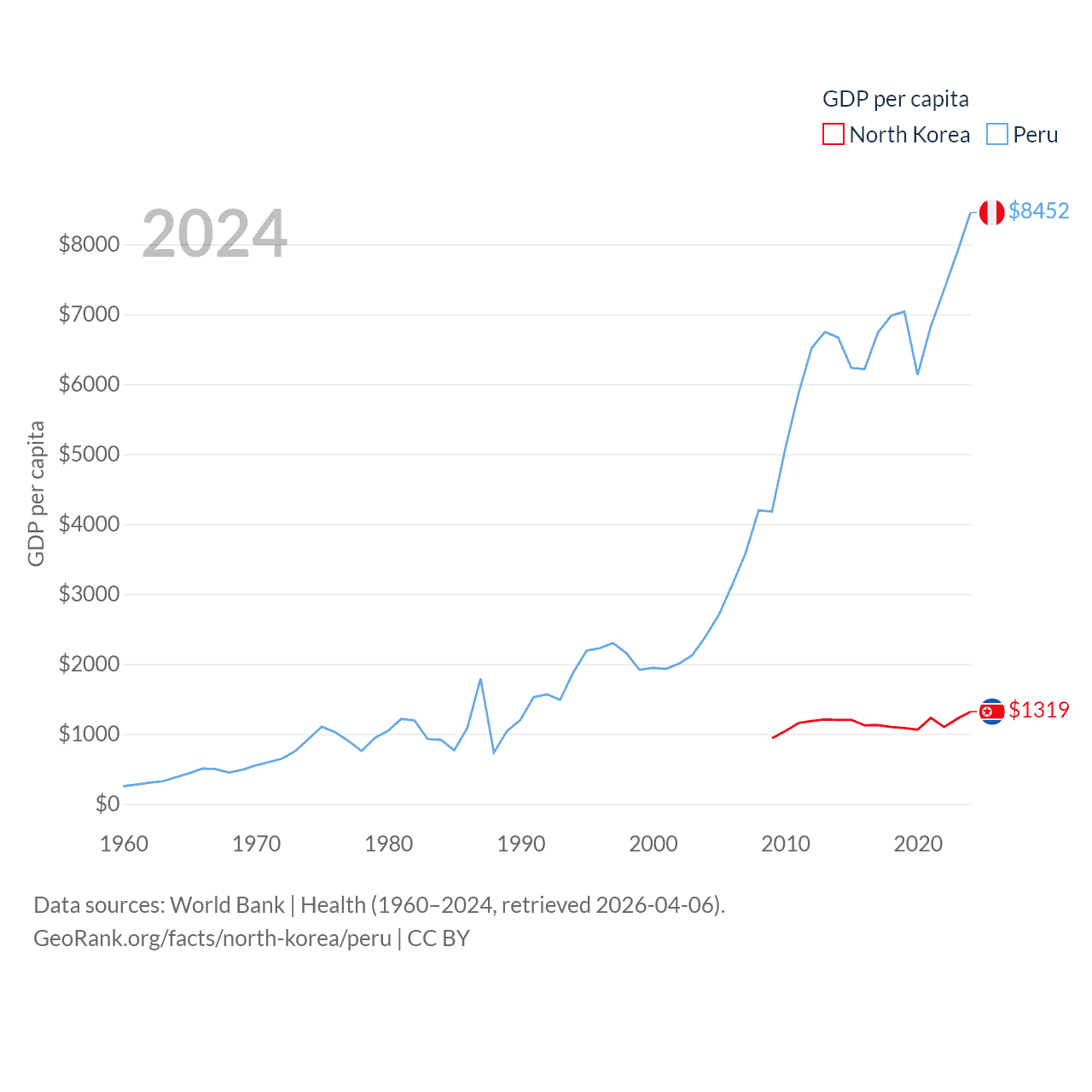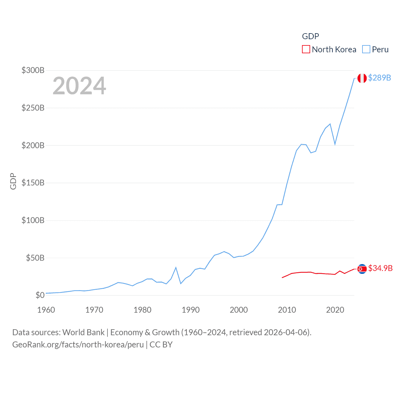 By GDP, North Korea ranks 106/197 ($34.9B) and Peru ranks 49/197 ($289B). By GDP per capita, North Korea ranks 168/197 ($1,319), while Peru ranks 91/197 ($8,452).