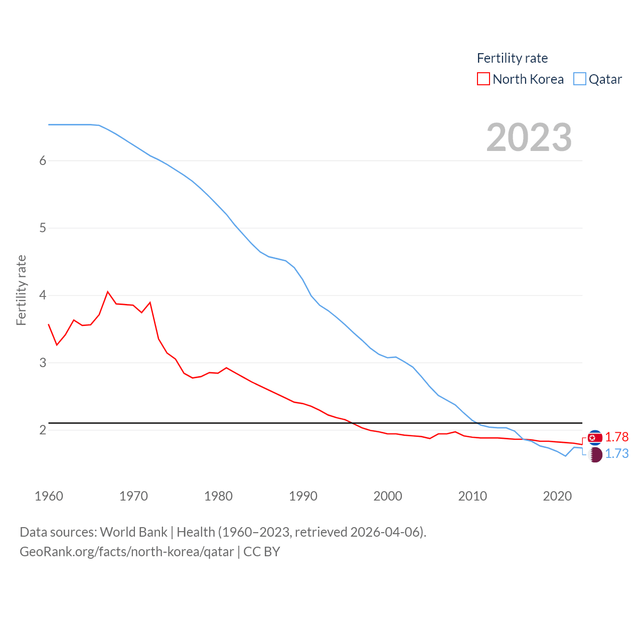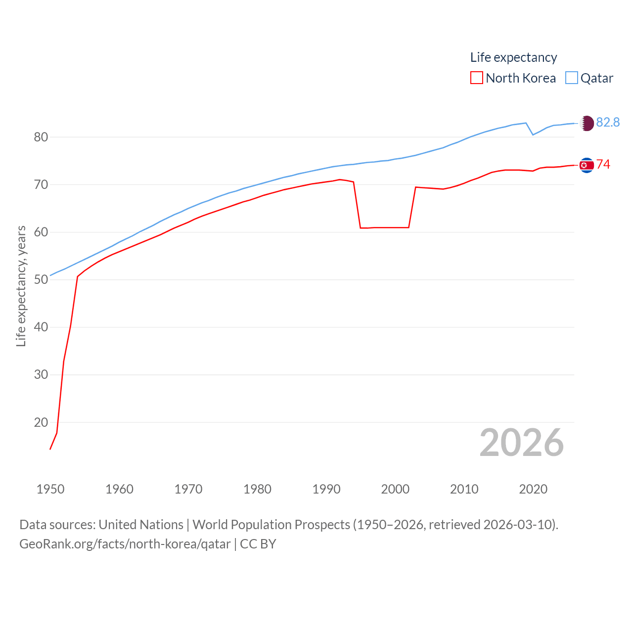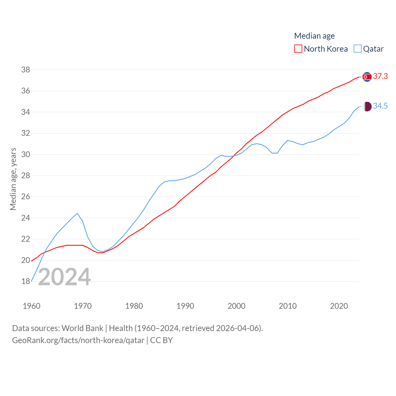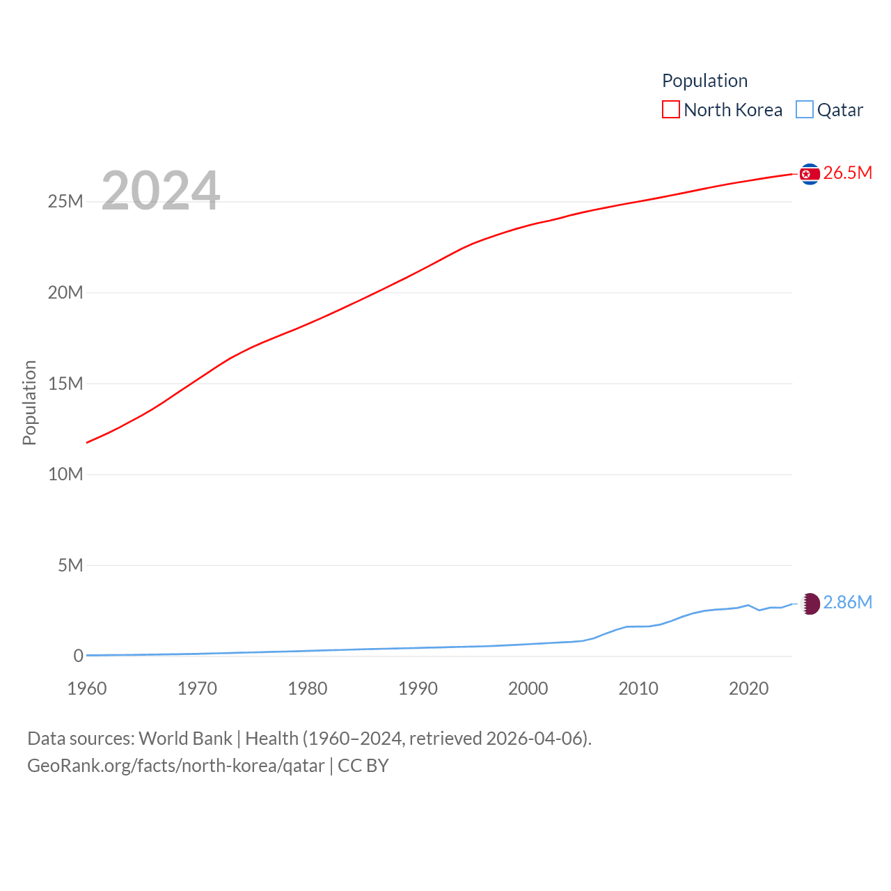 North Korea has a population of 26.5M (ranked 56/197), compared with 2.86M in Qatar (ranked 138/197). North Korea's land area is 46,491 sq mi versus 4,436 sq mi for Qatar (ranked 97th vs. 158th).