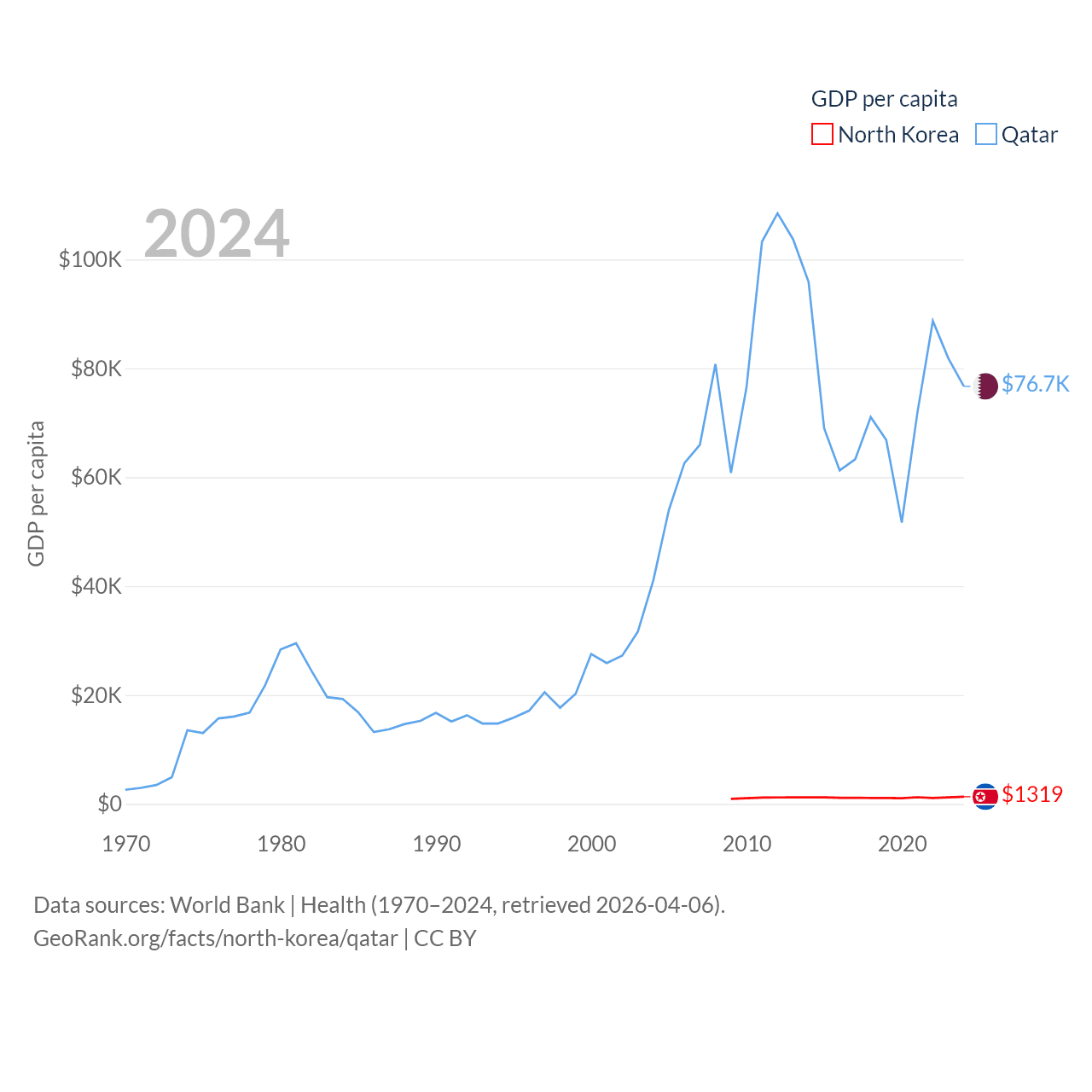 By GDP, North Korea ranks 106/197 ($34.9B) and Qatar ranks 56/197 ($219B). By GDP per capita, North Korea ranks 168/197 ($1,319), while Qatar ranks 11/197 ($76,689).