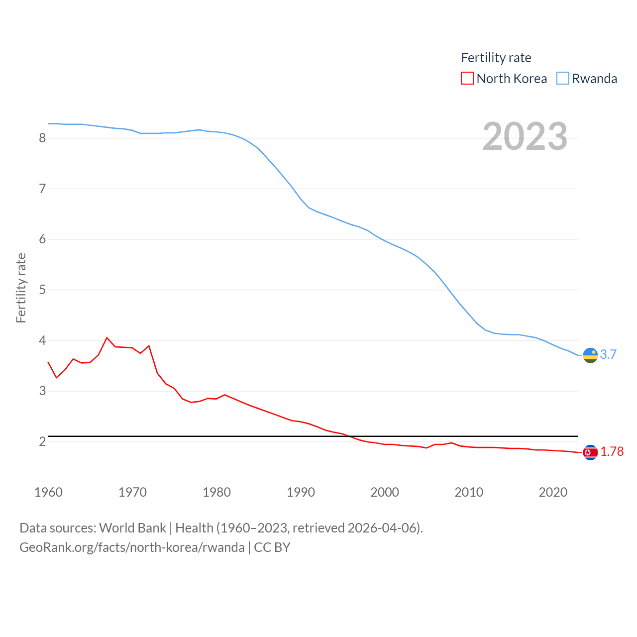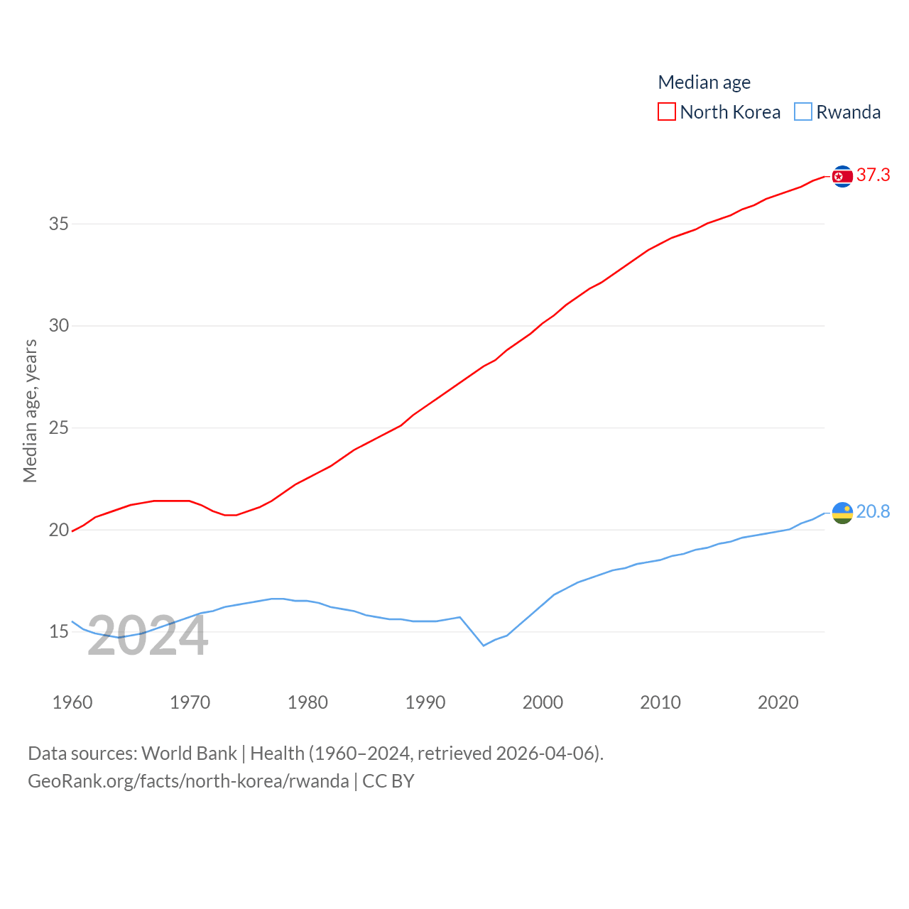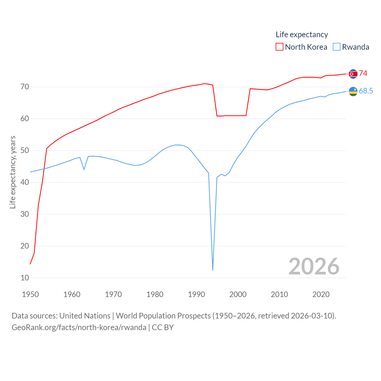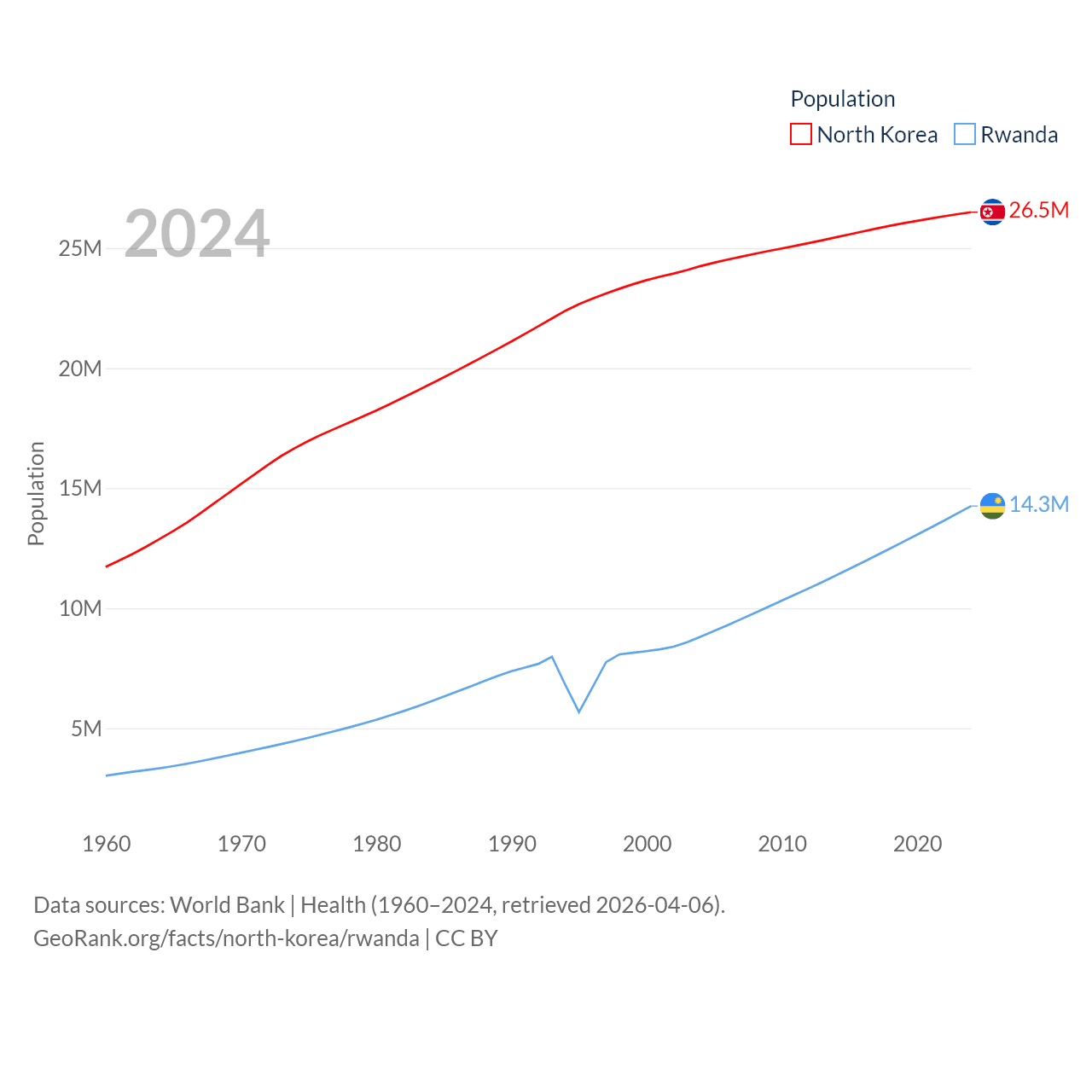 North Korea has a population of 26.5M (ranked 56/197), compared with 14.3M in Rwanda (ranked 77/197). North Korea's land area is 46,491 sq mi versus 9,525 sq mi for Rwanda (ranked 97th vs. 146th).
