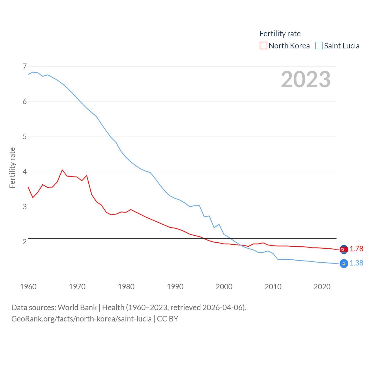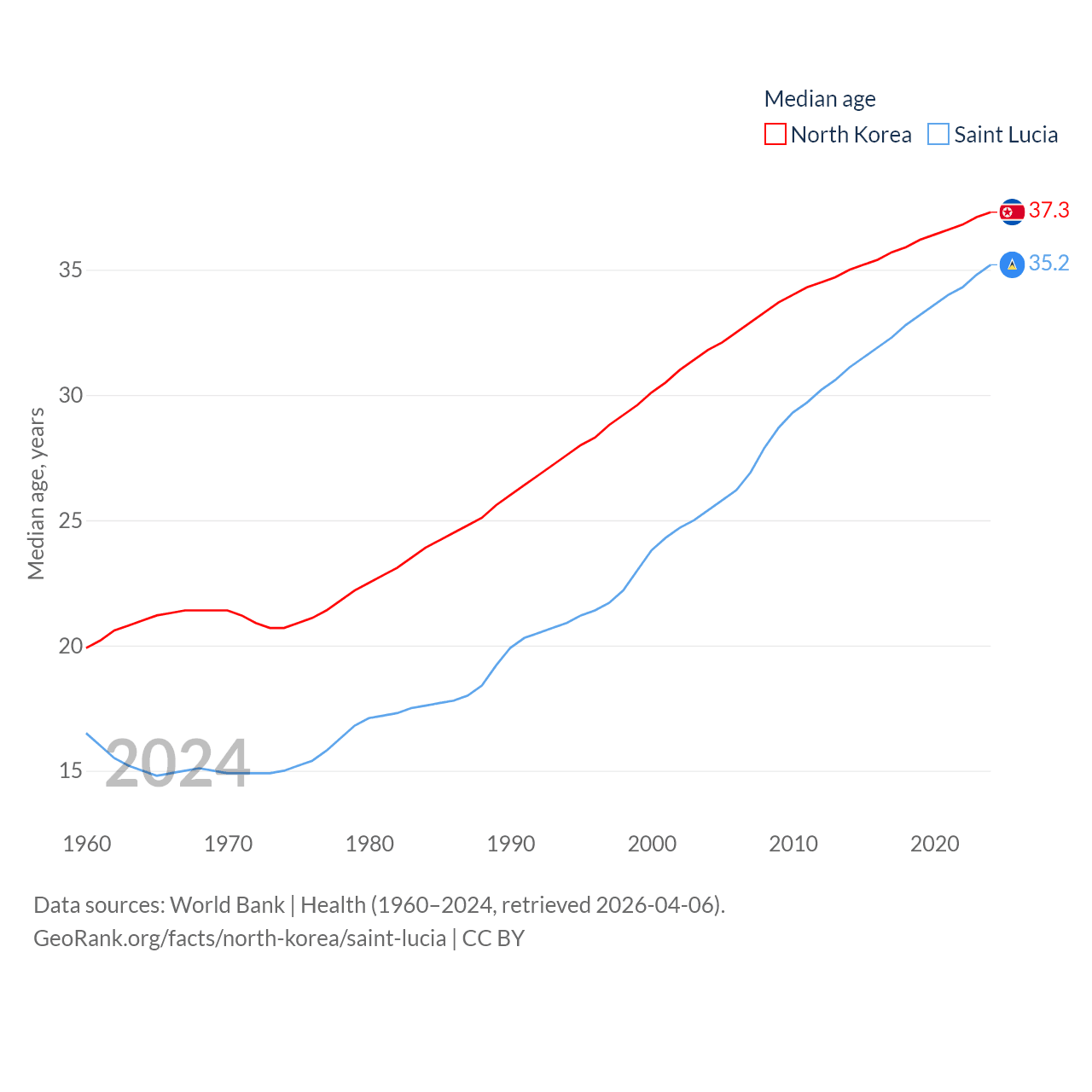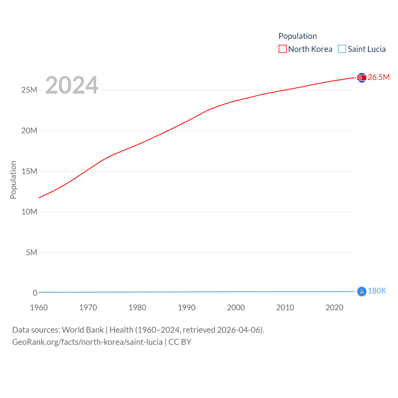 North Korea has a population of 26.5M (ranked 56/197), compared with 180K in Saint Lucia (ranked 178/197). North Korea's land area is 46,491 sq mi versus 235.5 sq mi for Saint Lucia (ranked 97th vs. 178th).