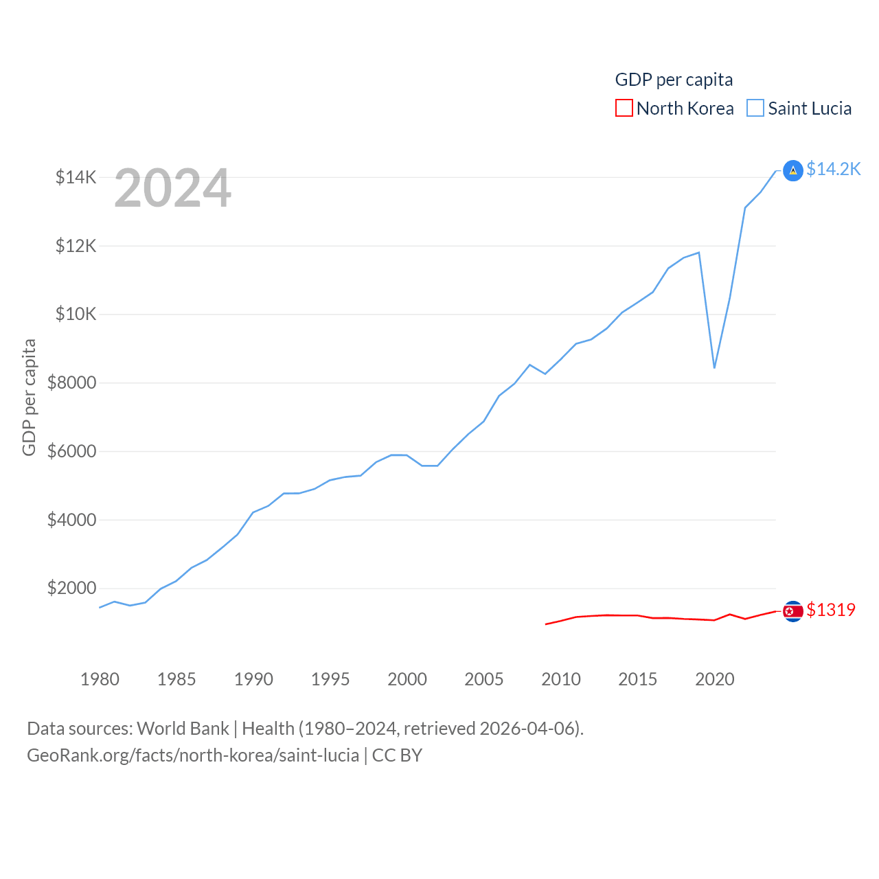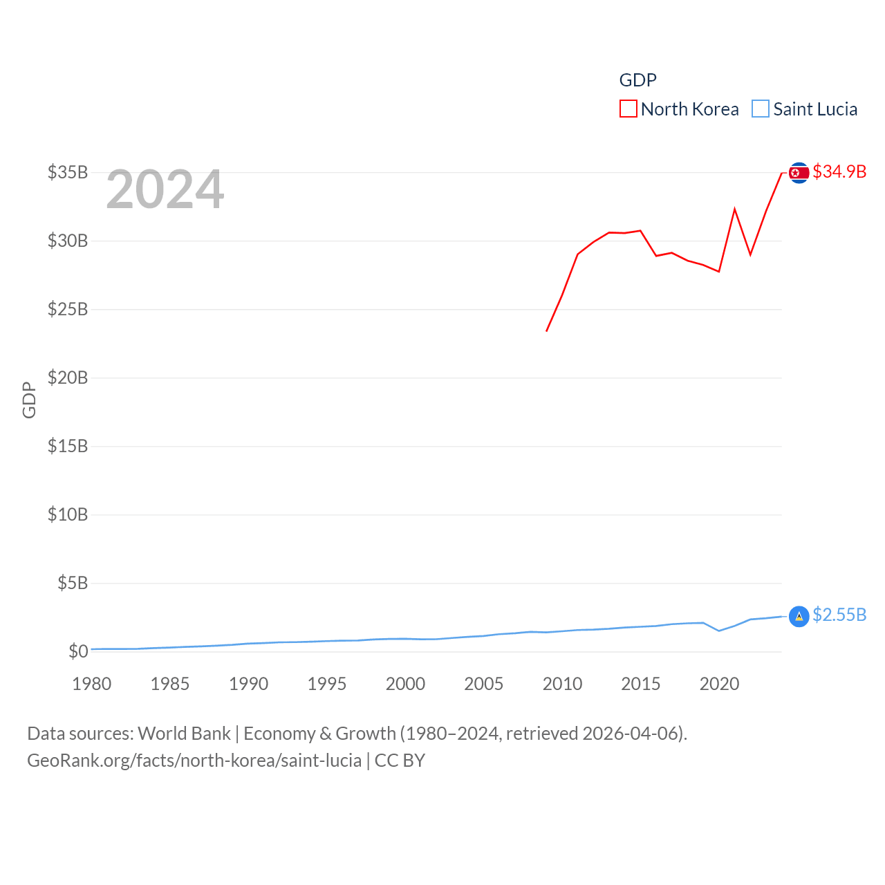 By GDP, North Korea ranks 106/197 ($34.9B) and Saint Lucia ranks 173/197 ($2.55B). By GDP per capita, North Korea ranks 168/197 ($1,319), while Saint Lucia ranks 70/197 ($14,182).