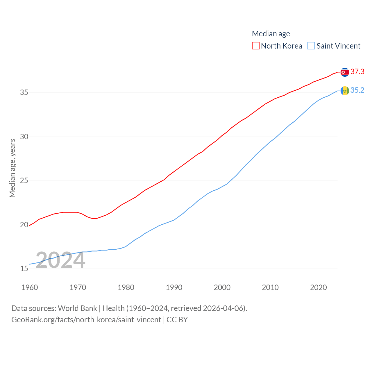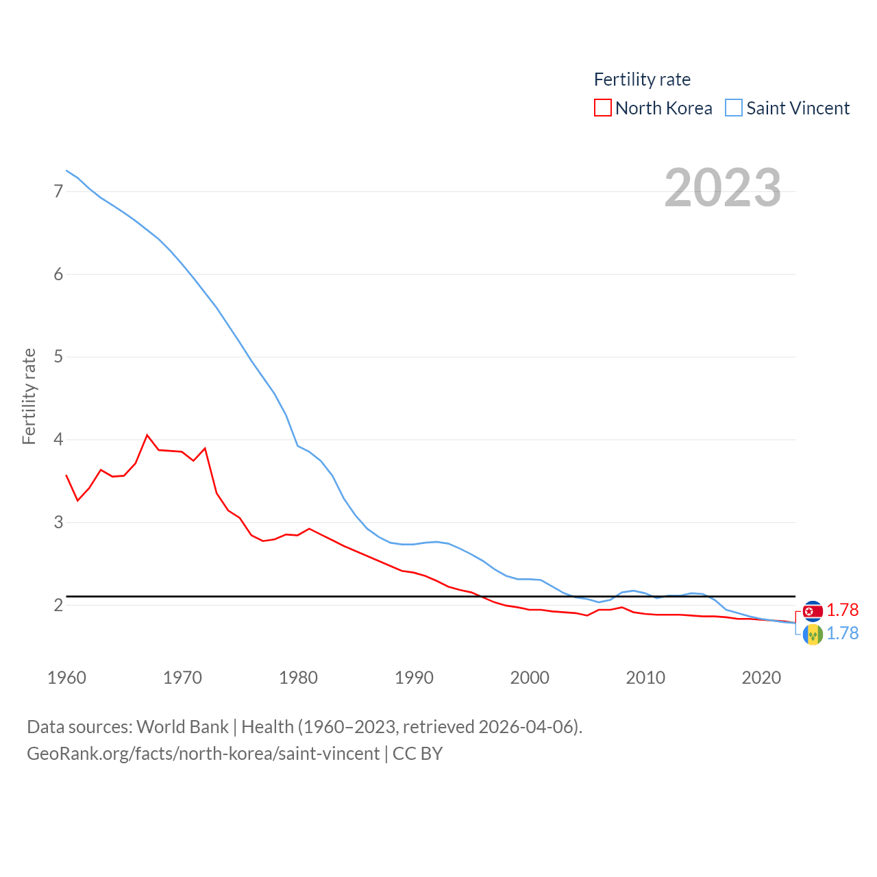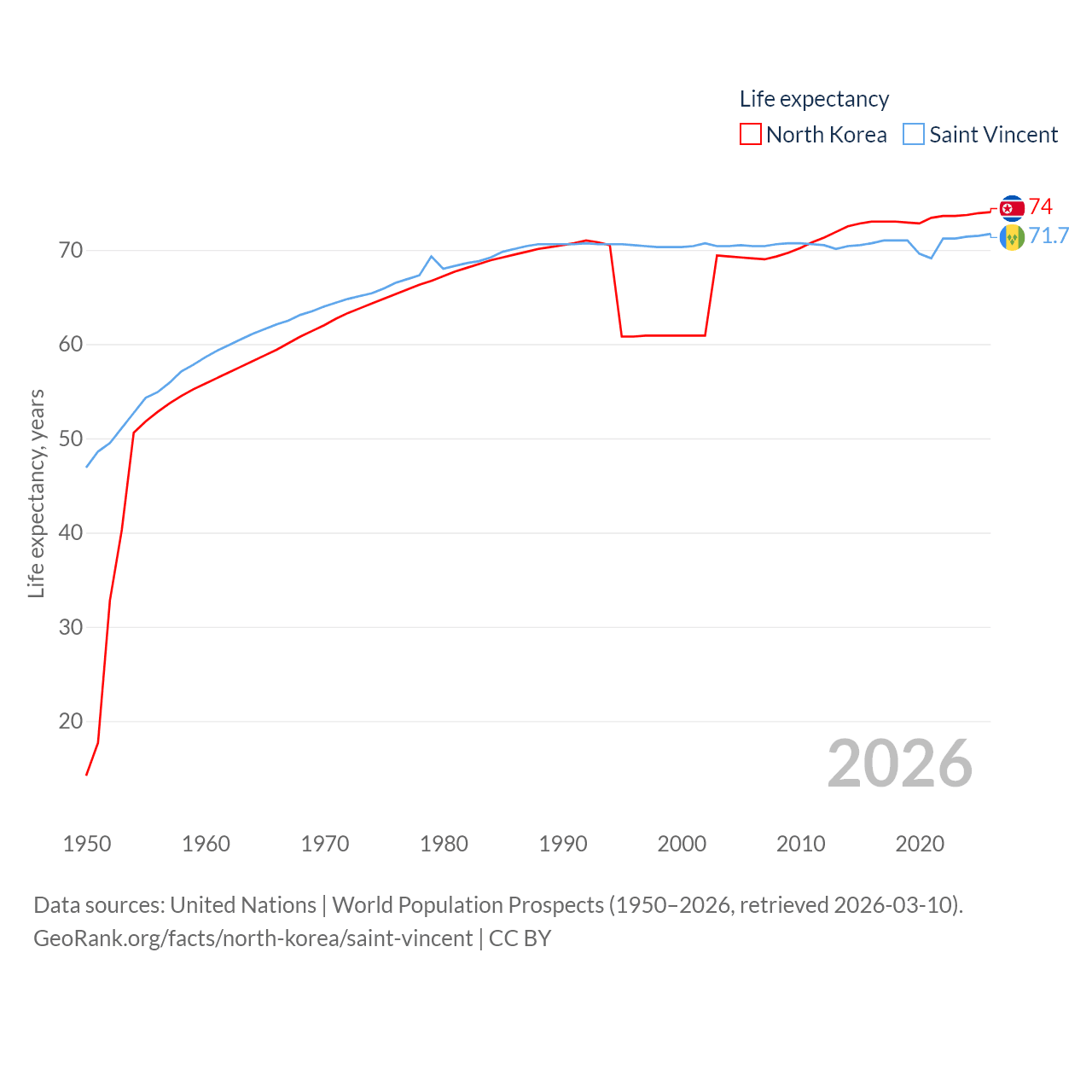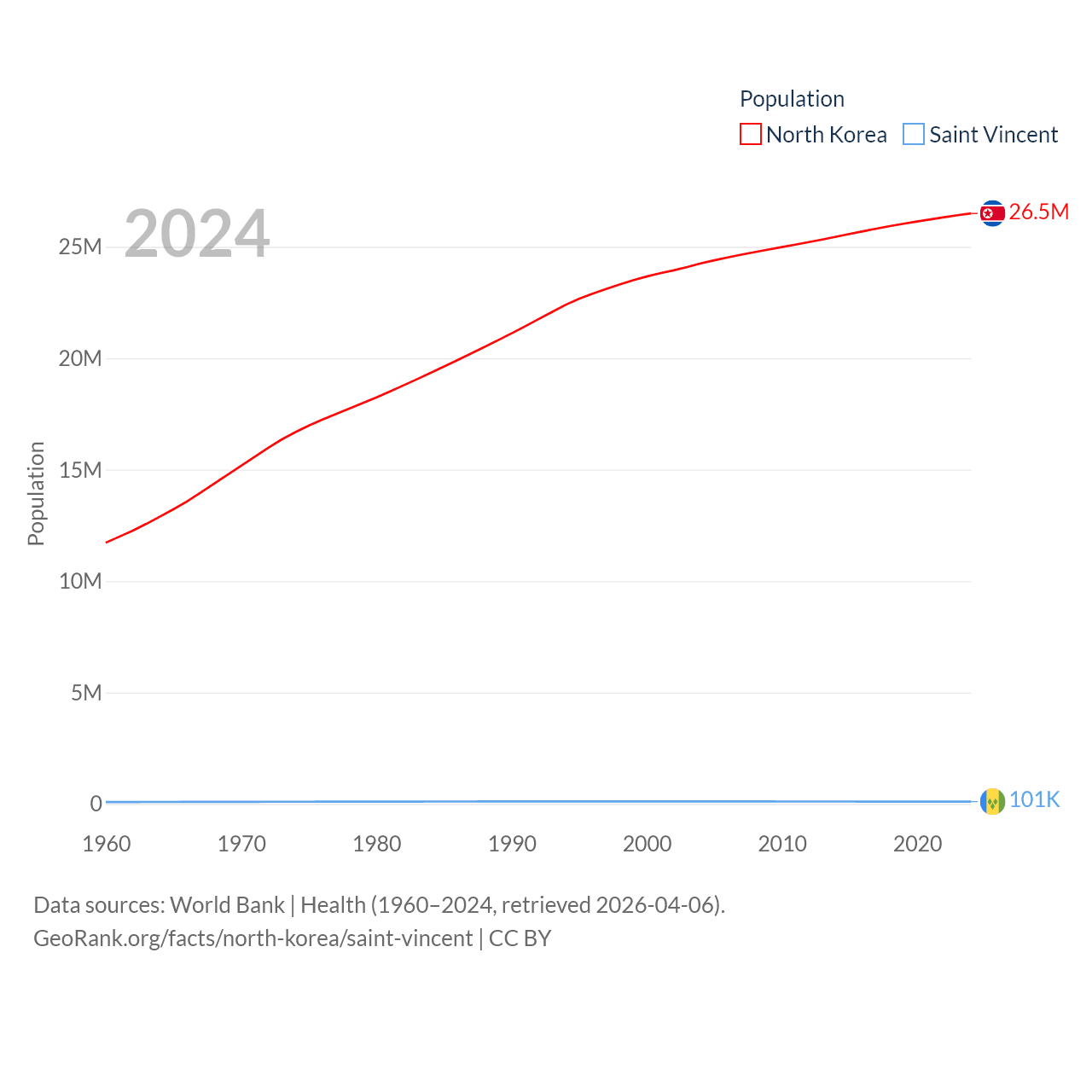 North Korea has a population of 26.5M (ranked 56/197), compared with 101K in Saint Vincent (ranked 184/197). North Korea's land area is 46,491 sq mi versus 150.6 sq mi for Saint Vincent (ranked 97th vs. 185th).