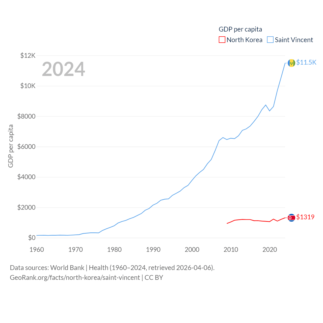 By GDP, North Korea ranks 106/197 ($34.9B) and Saint Vincent ranks 186/197 ($1.16B). By GDP per capita, North Korea ranks 168/197 ($1,319), while Saint Vincent ranks 81/197 ($11,501).