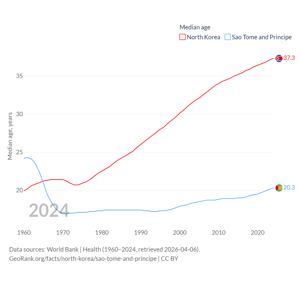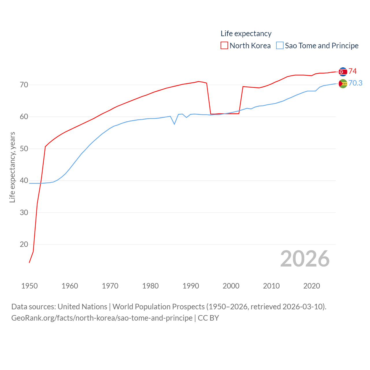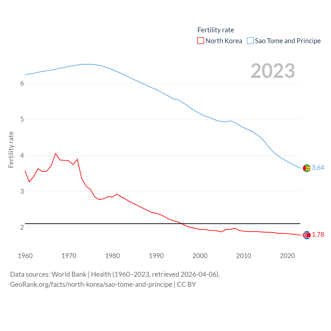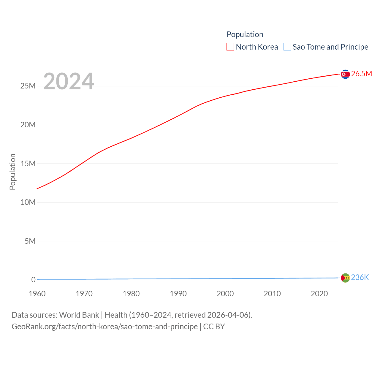 North Korea has a population of 26.5M (ranked 56/197), compared with 236K in Sao Tome and Principe (ranked 176/197). North Korea's land area is 46,491 sq mi versus 371 sq mi for Sao Tome and Principe (ranked 97th vs. 172nd).