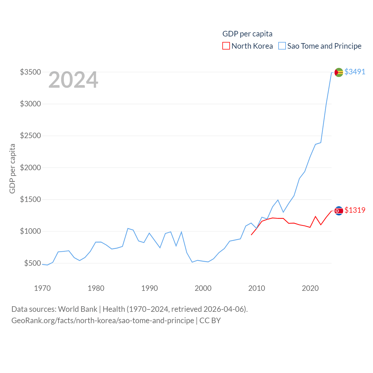 By GDP, North Korea ranks 106/197 ($34.9B) and Sao Tome and Principe ranks 189/197 ($822M). By GDP per capita, North Korea ranks 168/197 ($1,319), while Sao Tome and Principe ranks 134/197 ($3,491).