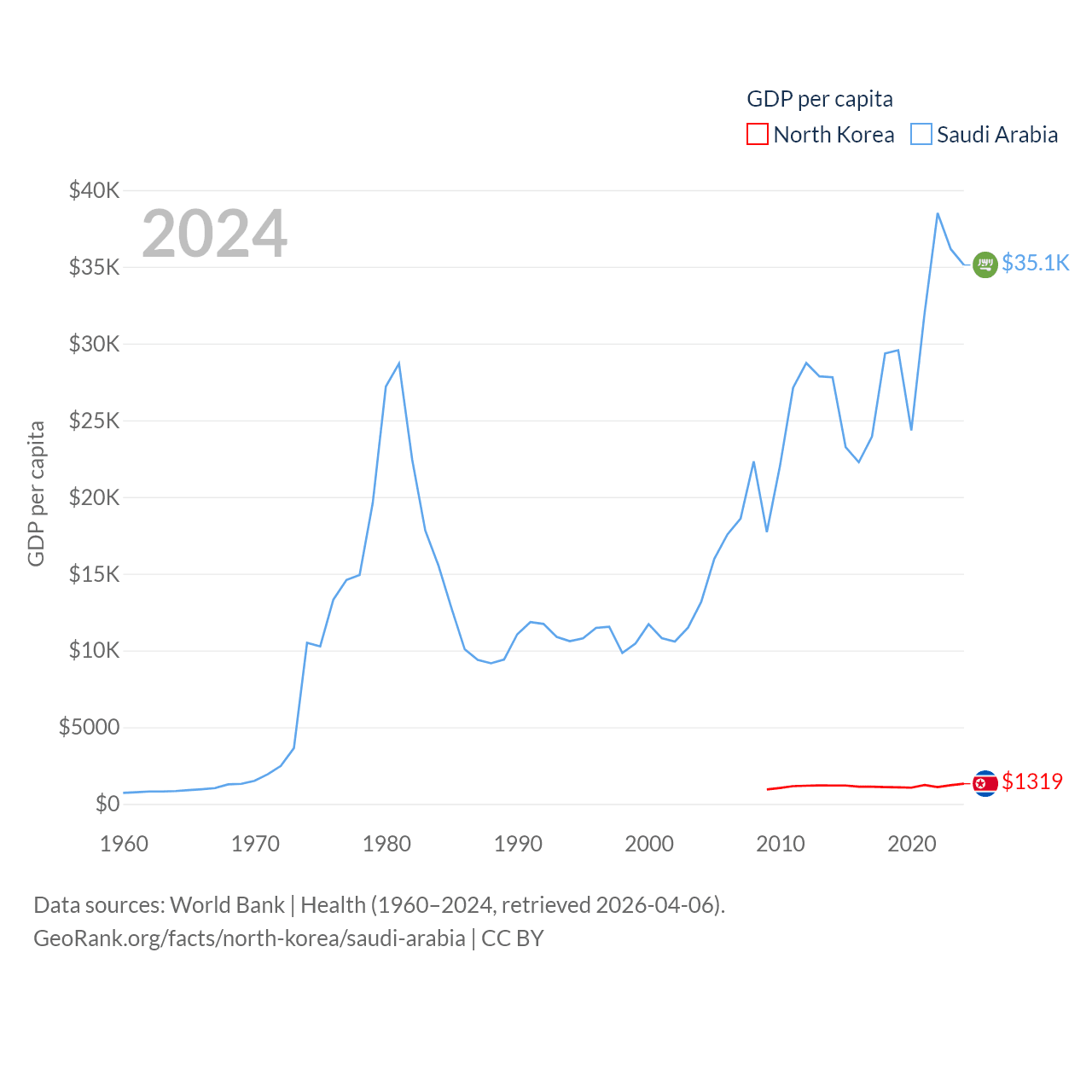 By GDP, North Korea ranks 106/197 ($34.9B) and Saudi Arabia ranks 18/197 ($1.24T). By GDP per capita, North Korea ranks 168/197 ($1,319), while Saudi Arabia ranks 33/197 ($35,122).
