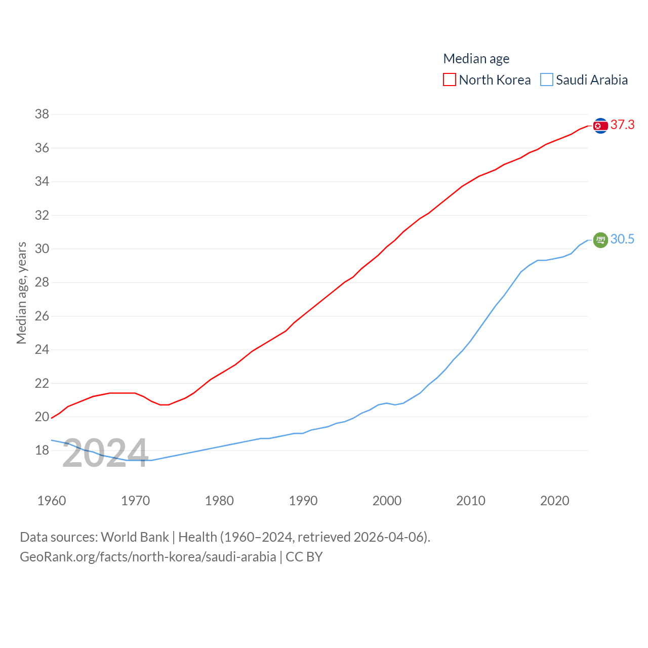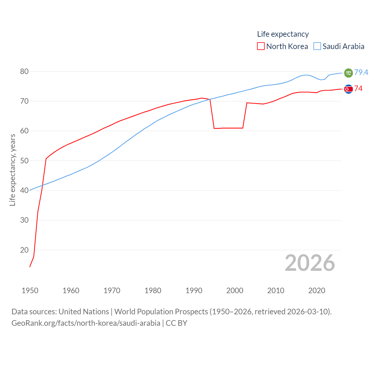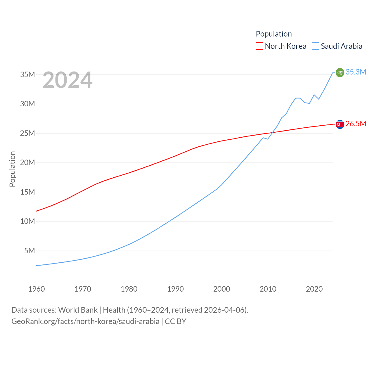 North Korea has a population of 26.5M (ranked 56/197), compared with 35.3M in Saudi Arabia (ranked 45/197). North Korea's land area is 46,491 sq mi versus 830,000 sq mi for Saudi Arabia (ranked 97th vs. 12th).