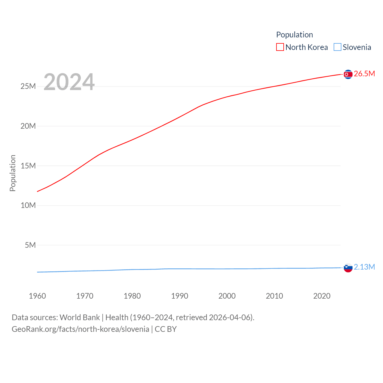 North Korea has a population of 26.5M (ranked 56/197), compared with 2.13M in Slovenia (ranked 147/197). North Korea's land area is 46,491 sq mi versus 7,774 sq mi for Slovenia (ranked 97th vs. 151st).