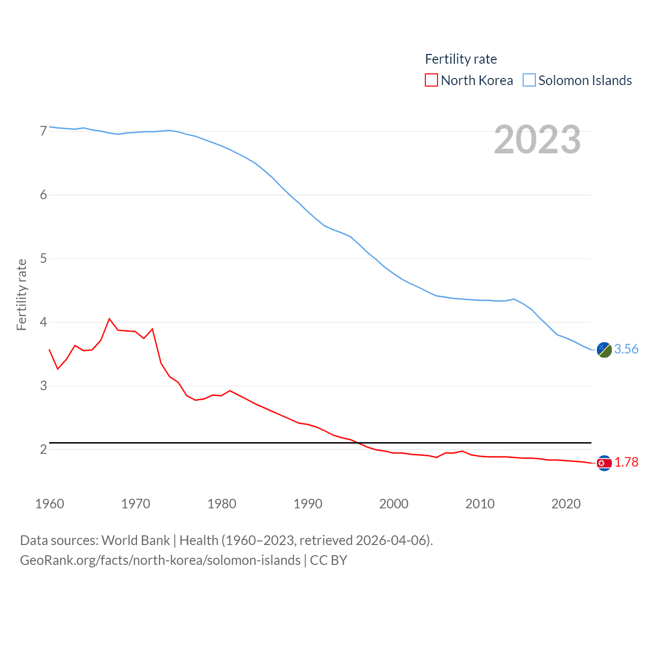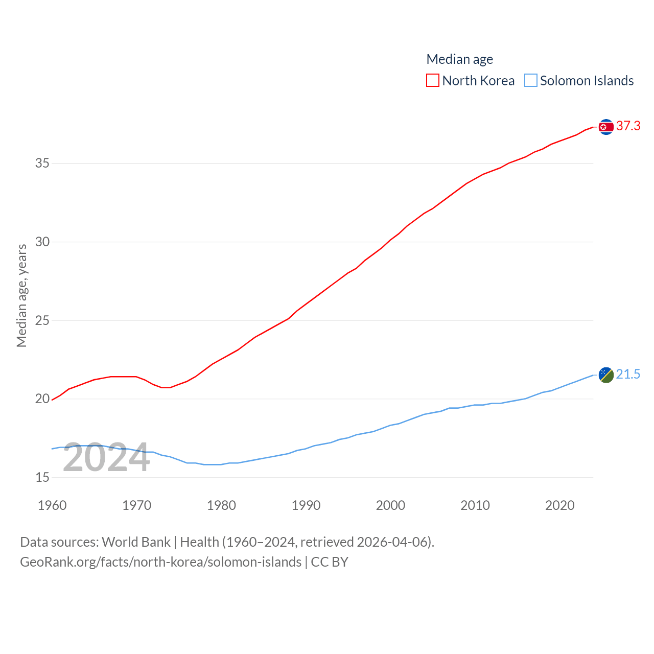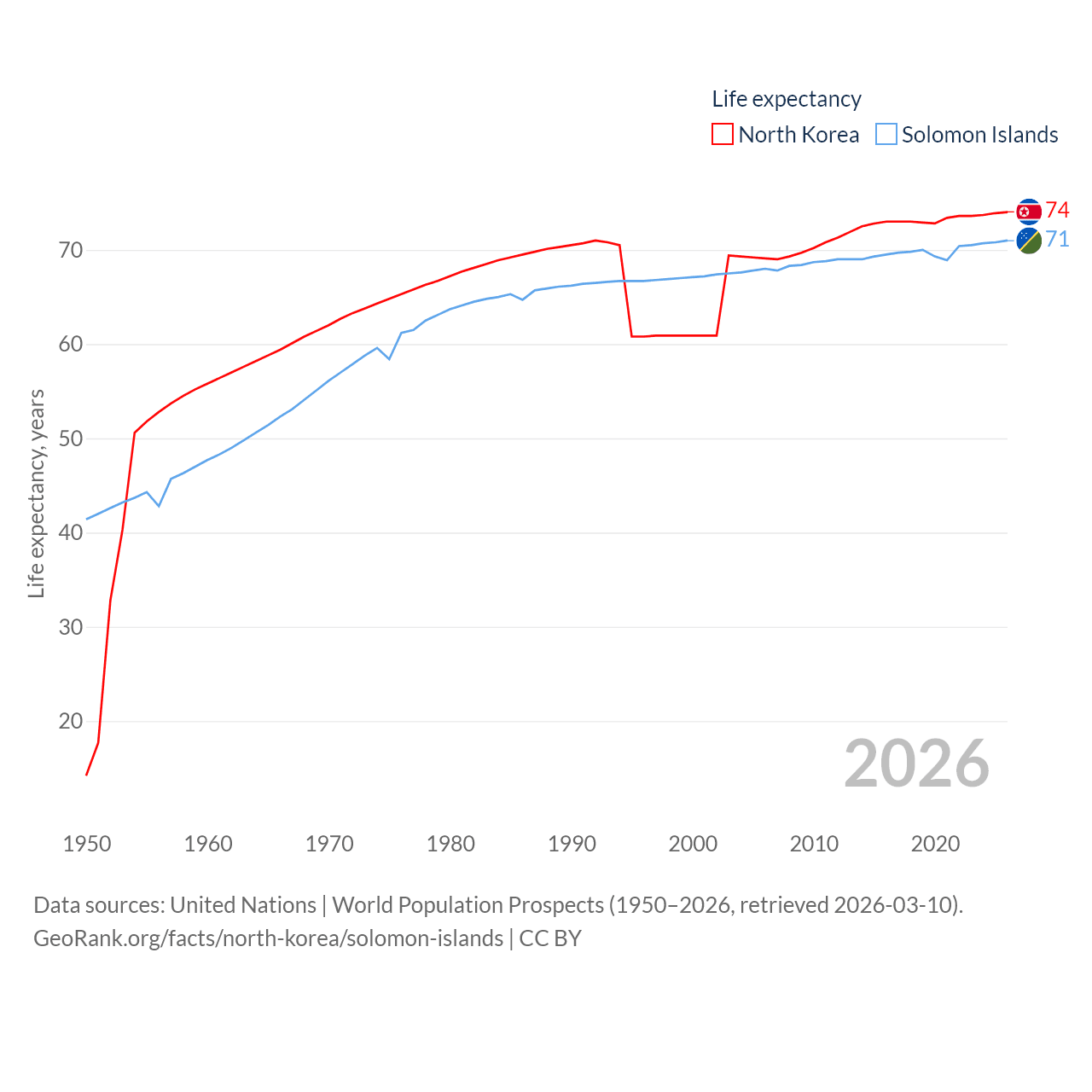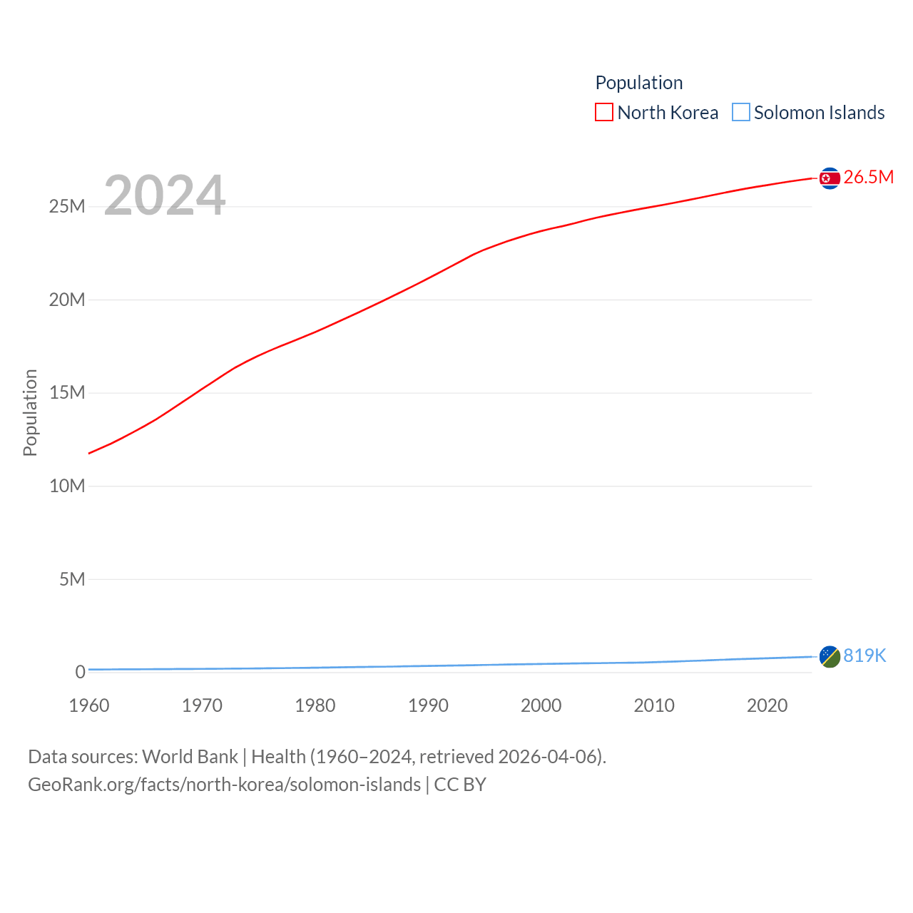 North Korea has a population of 26.5M (ranked 56/197), compared with 819K in The Solomon Islands (ranked 162/197). North Korea's land area is 46,491 sq mi versus 10,807 sq mi for The Solomon Islands (ranked 97th vs. 141st).