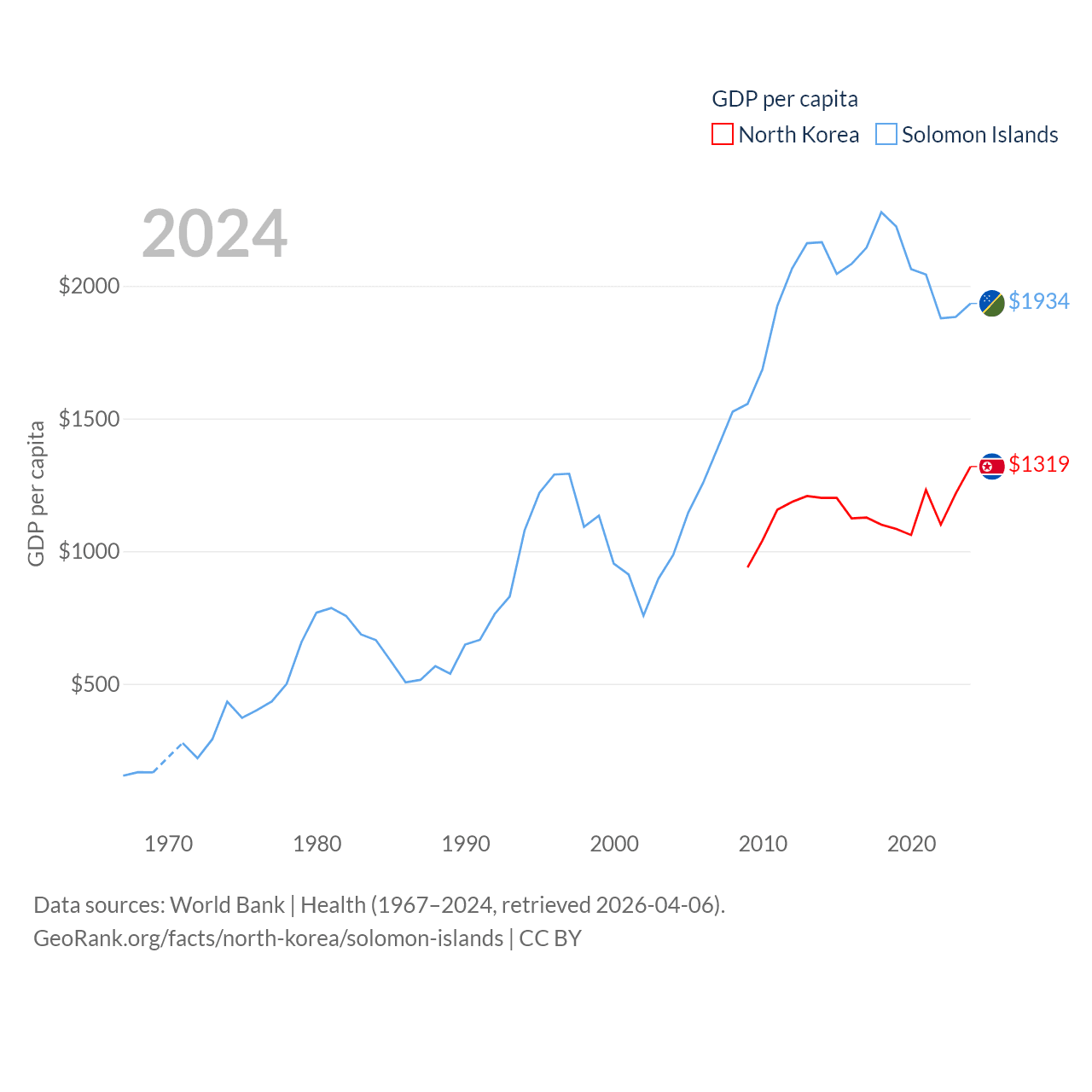 By GDP, North Korea ranks 106/197 ($34.9B) and The Solomon Islands ranks 182/197 ($1.58B). By GDP per capita, North Korea ranks 168/197 ($1,319), while The Solomon Islands ranks 157/197 ($1,934).