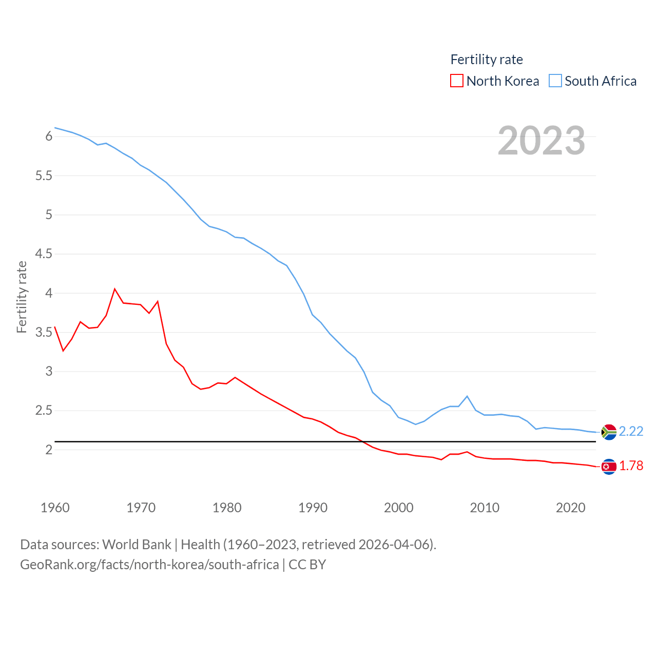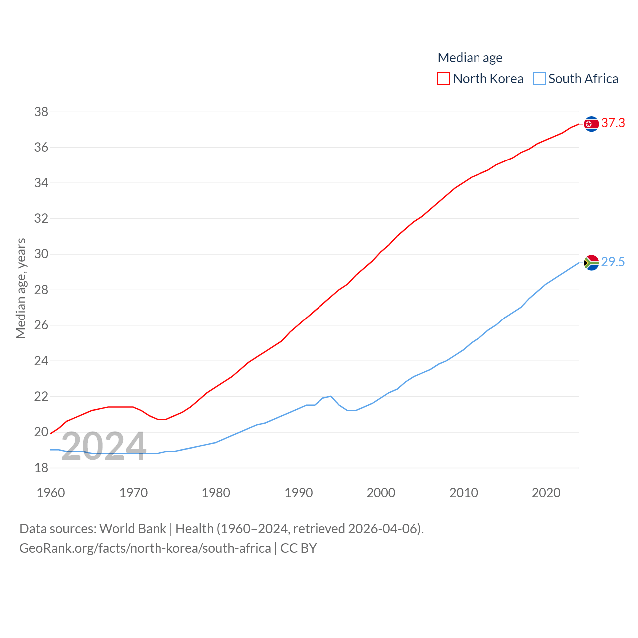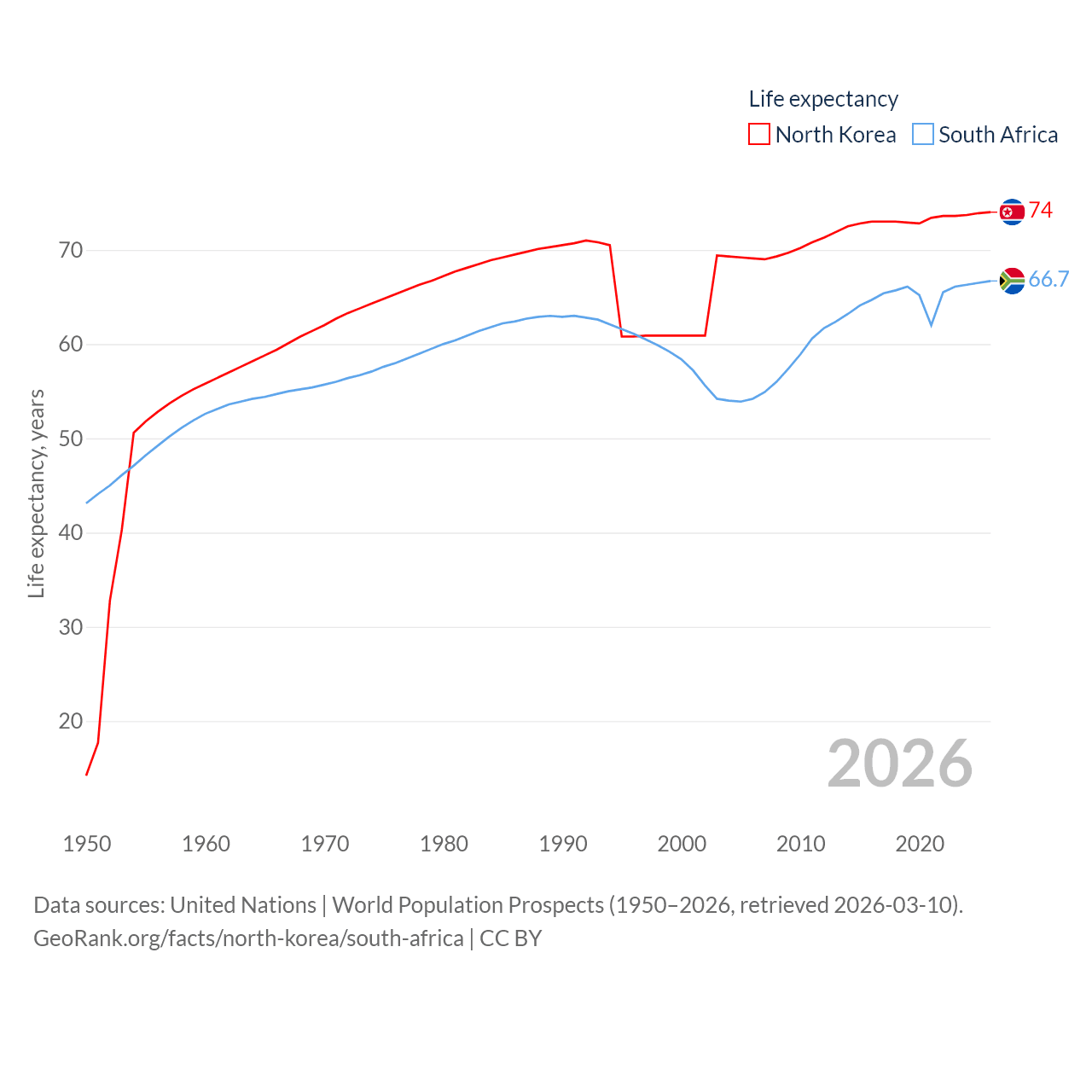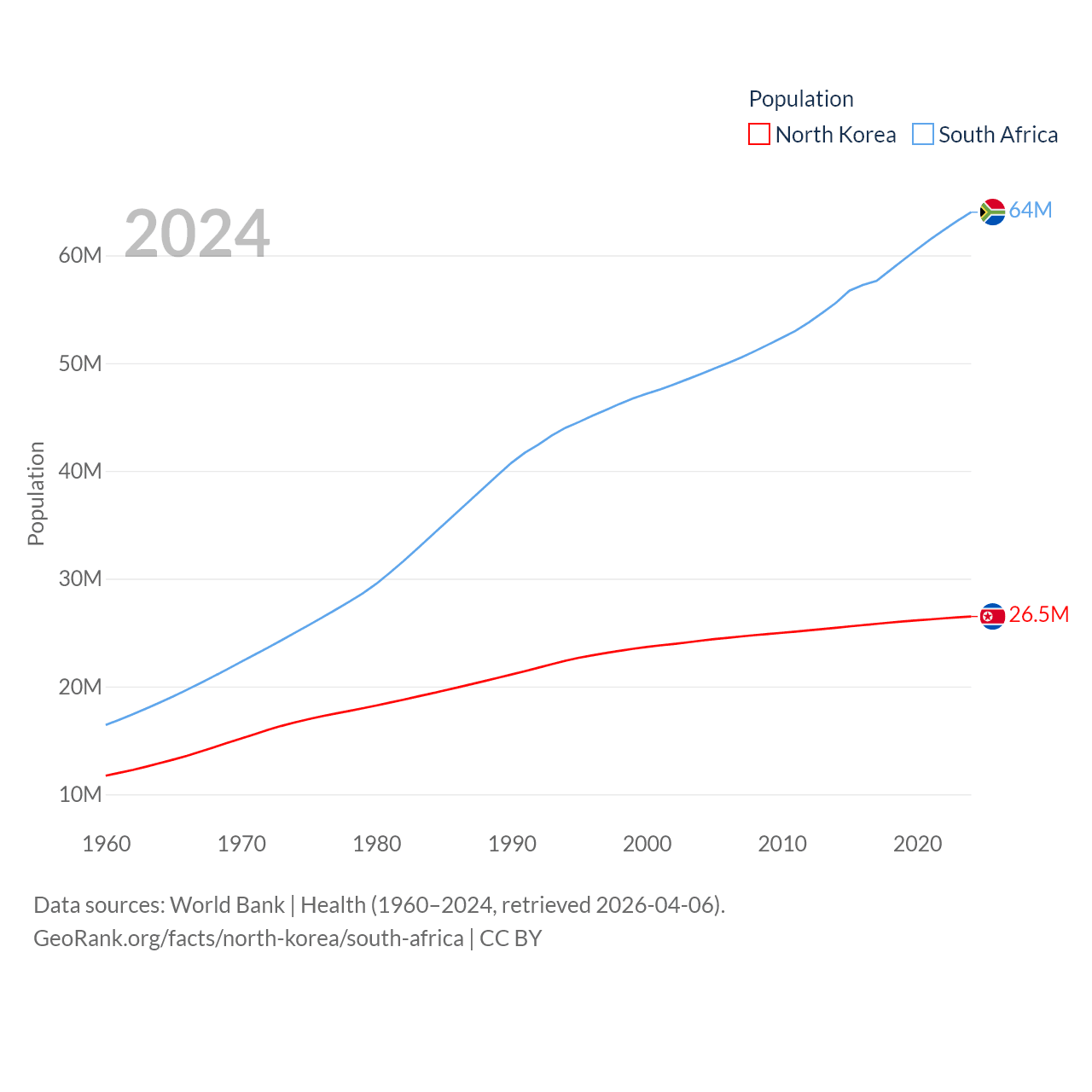 North Korea has a population of 26.5M (ranked 56/197), compared with 64M in South Africa (ranked 24/197). North Korea's land area is 46,491 sq mi versus 468,377 sq mi for South Africa (ranked 97th vs. 24th).