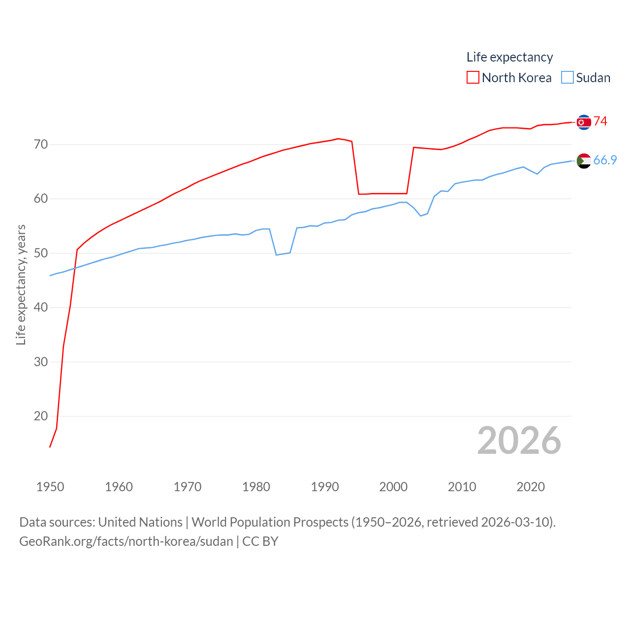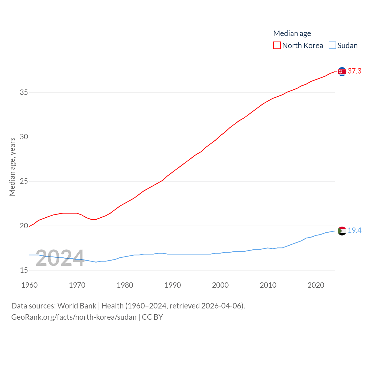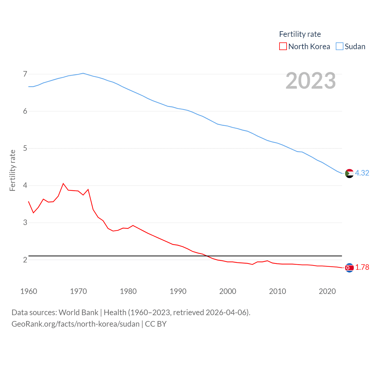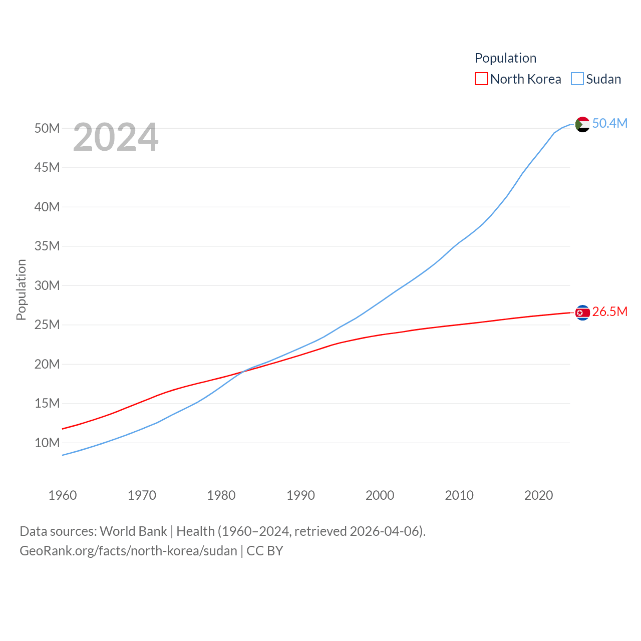 North Korea has a population of 26.5M (ranked 56/197), compared with 50.4M in Sudan (ranked 30/197). North Korea's land area is 46,491 sq mi versus 721,239 sq mi for Sudan (ranked 97th vs. 15th).