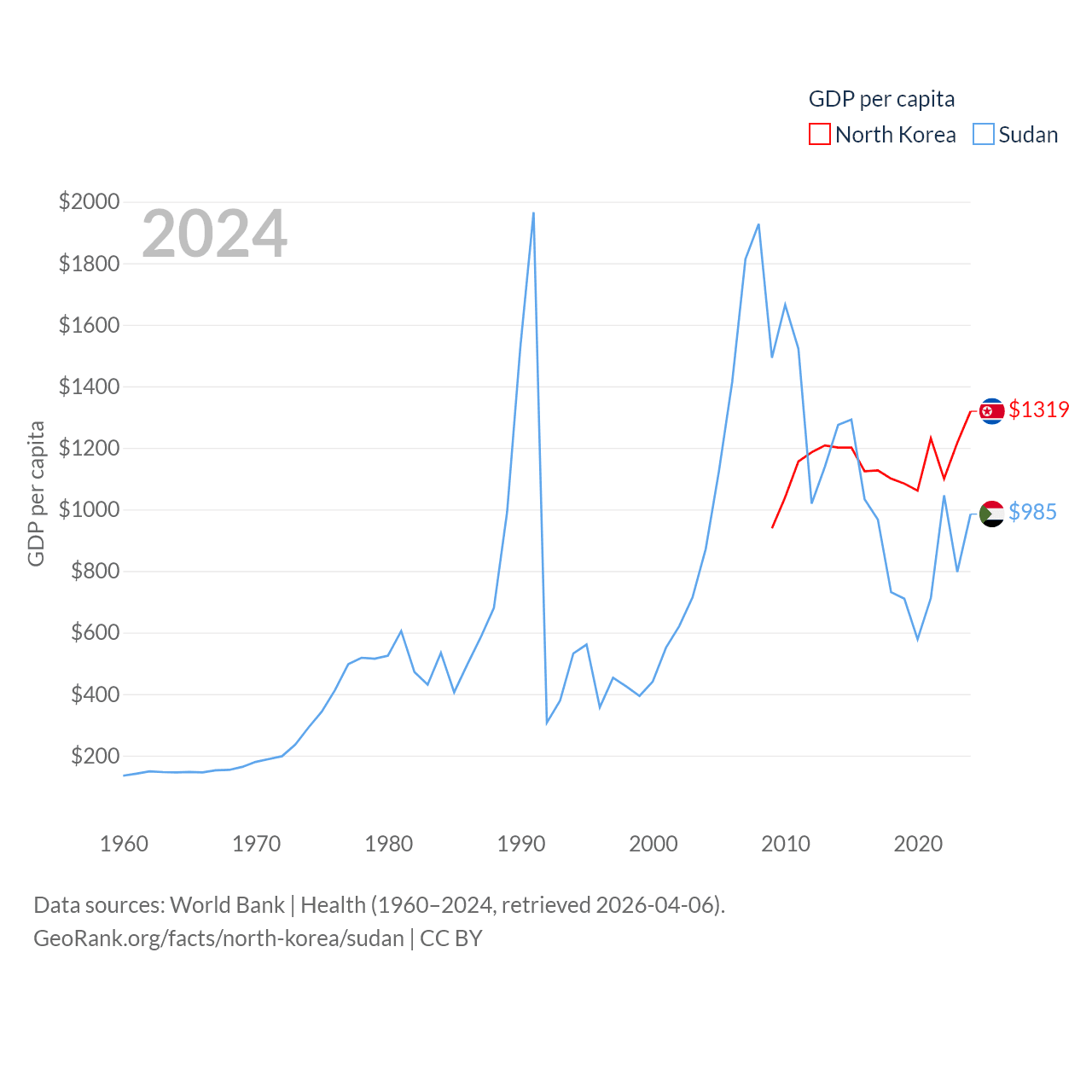 By GDP, North Korea ranks 106/197 ($34.9B) and Sudan ranks 94/197 ($49.7B). By GDP per capita, North Korea ranks 168/197 ($1,319), while Sudan ranks 179/197 ($985).
