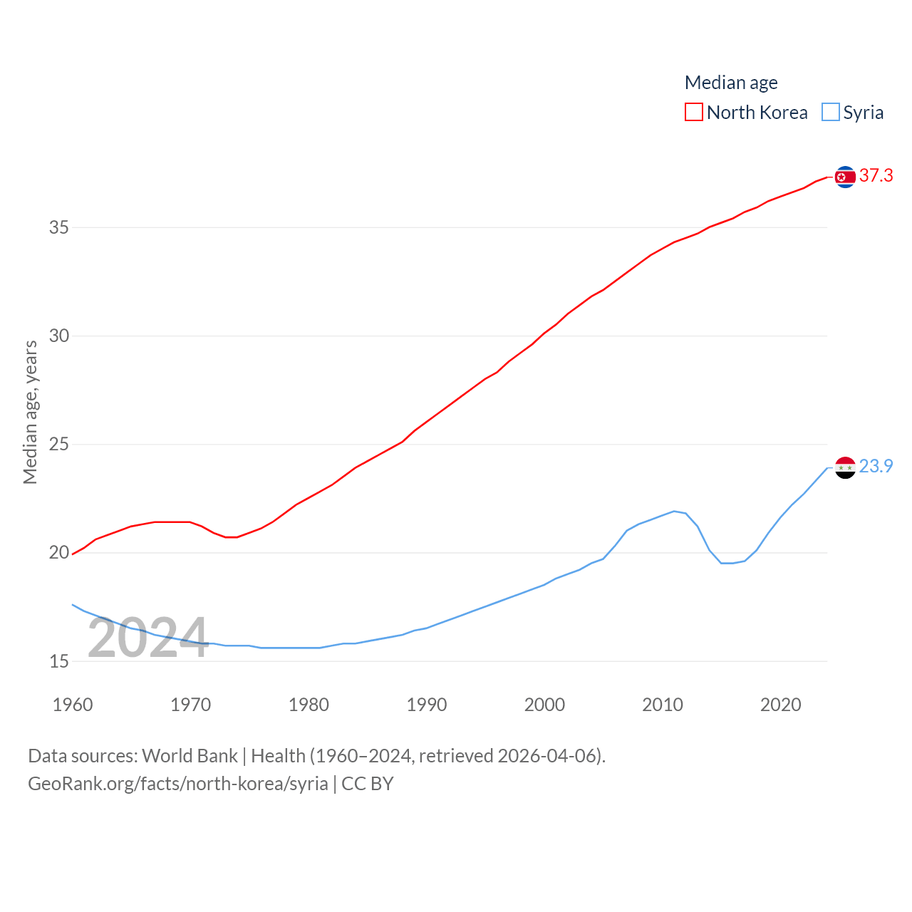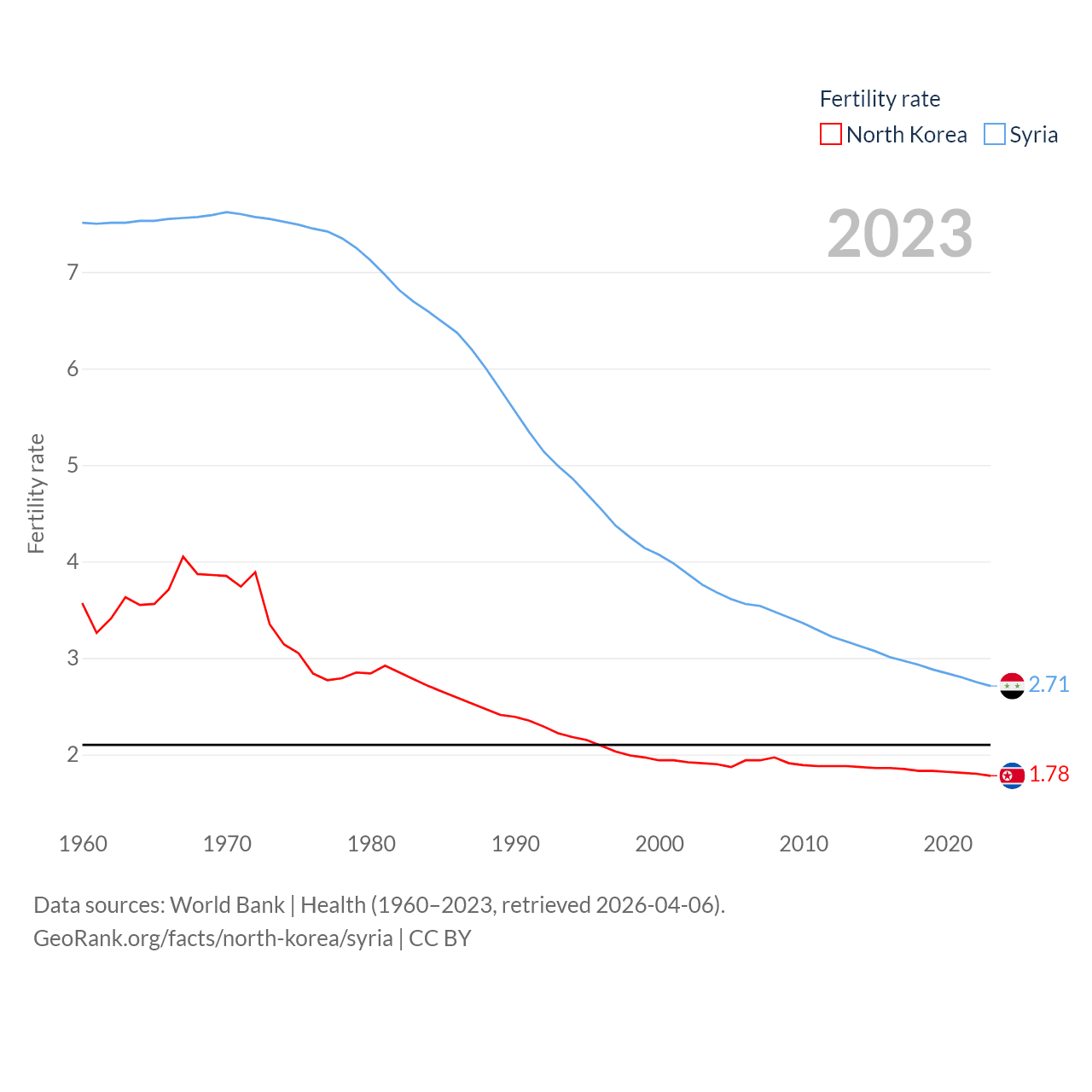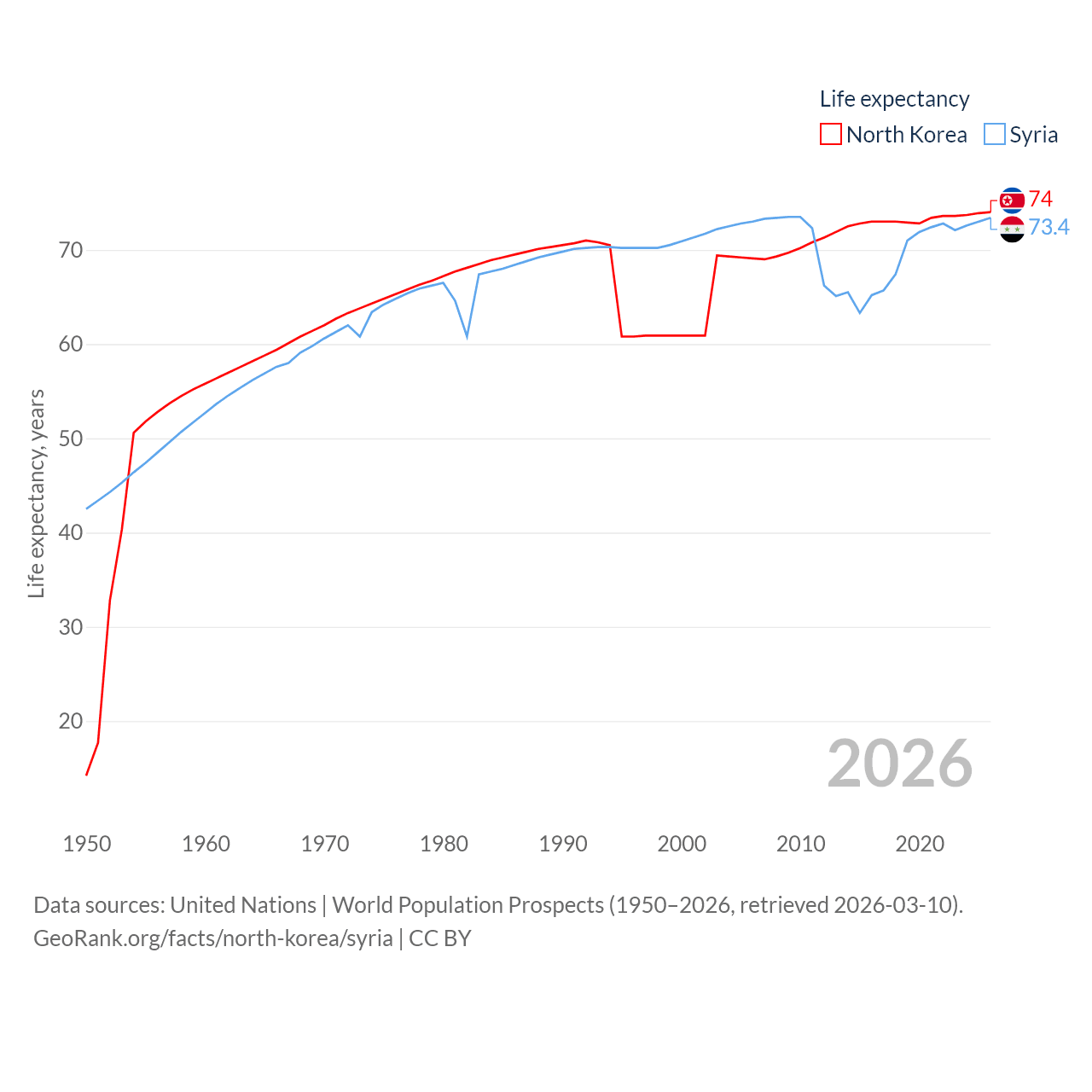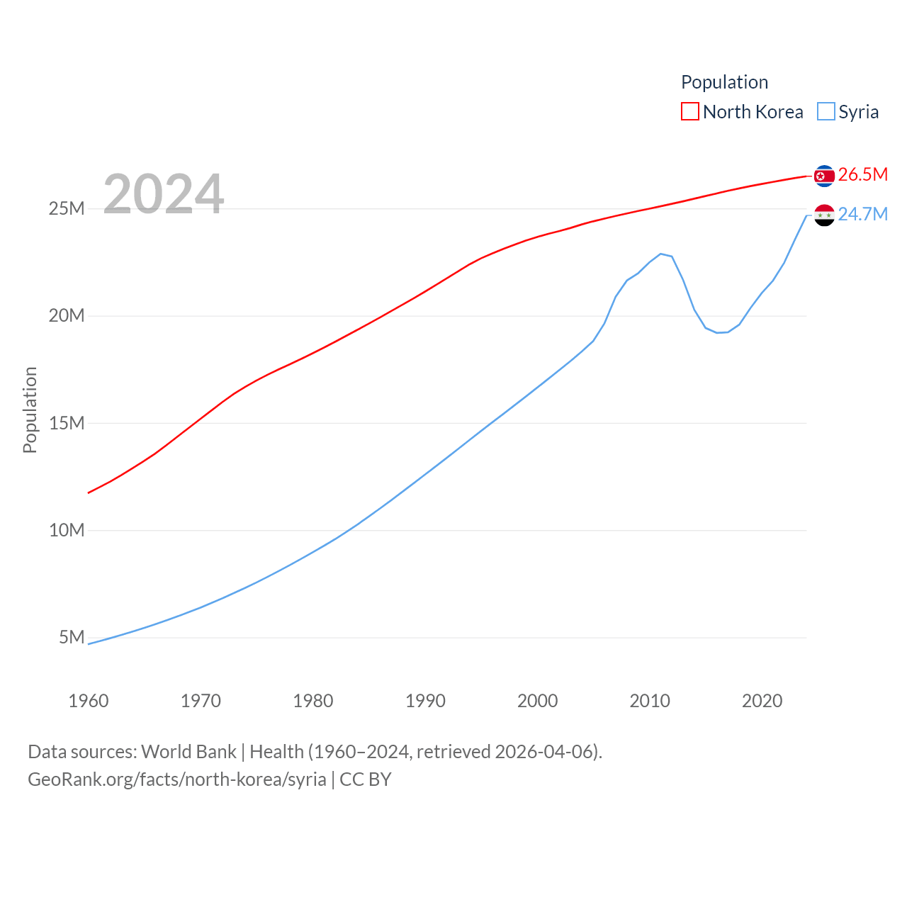 North Korea has a population of 26.5M (ranked 56/197), compared with 24.7M in Syria (ranked 57/197). North Korea's land area is 46,491 sq mi versus 70,900 sq mi for Syria (ranked 97th vs. 87th).