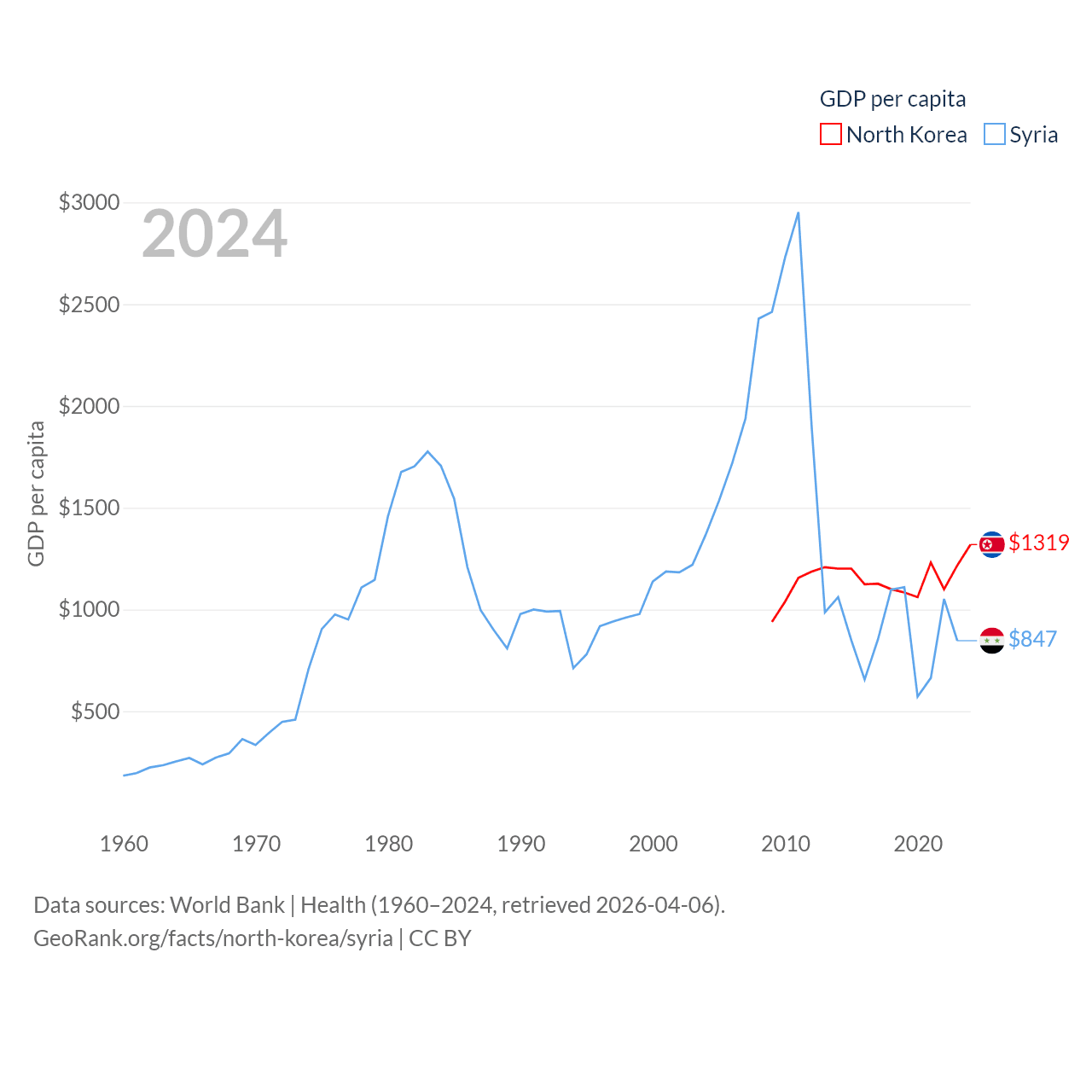 By GDP, North Korea ranks 106/197 ($34.9B) and Syria ranks 129/197 ($20B). By GDP per capita, North Korea ranks 168/197 ($1,319), while Syria ranks 185/197 ($847).
