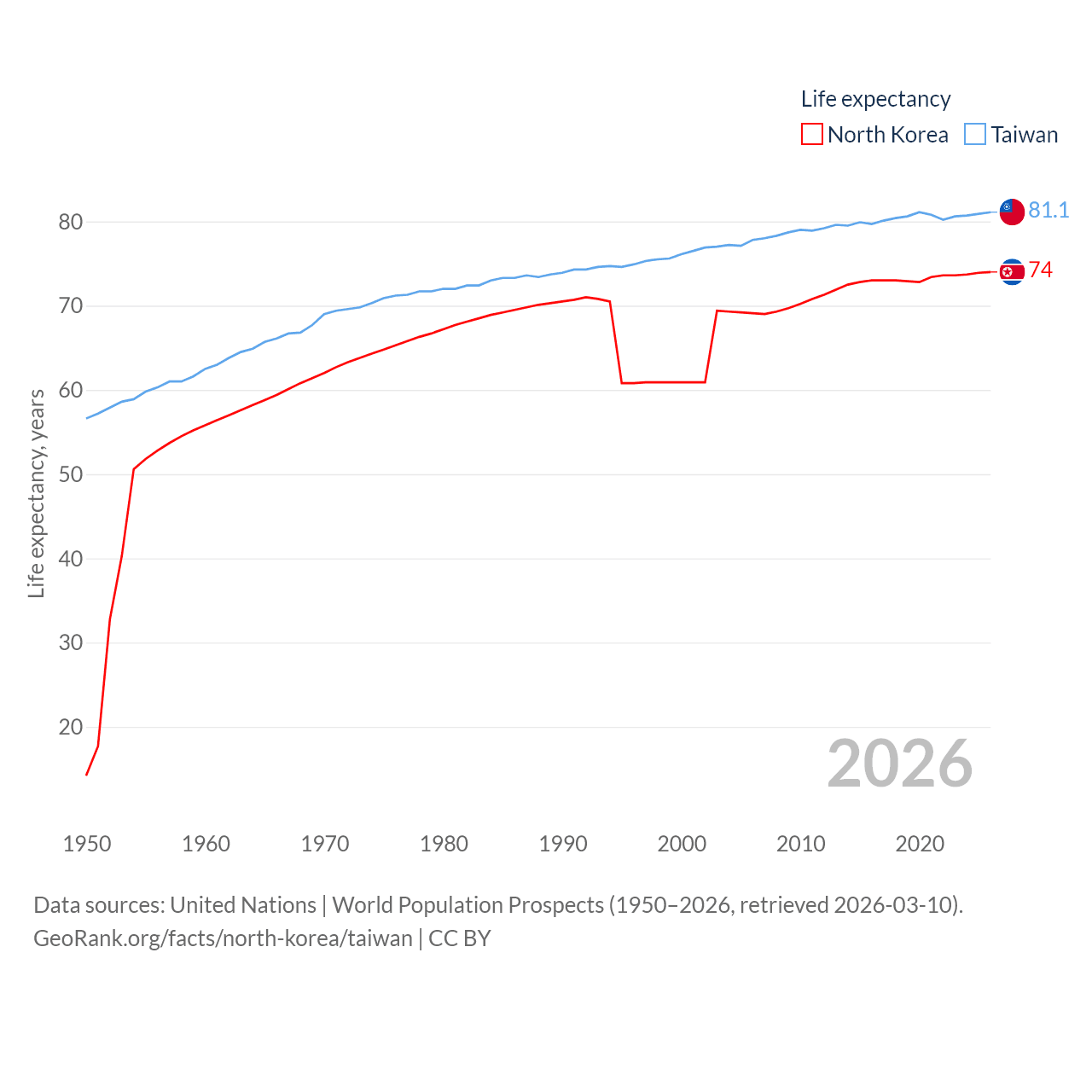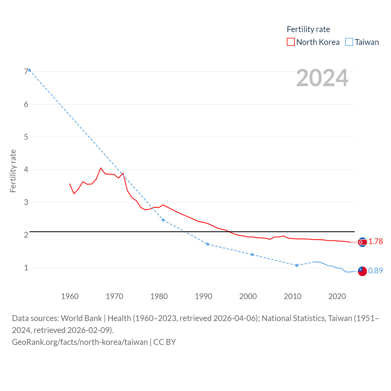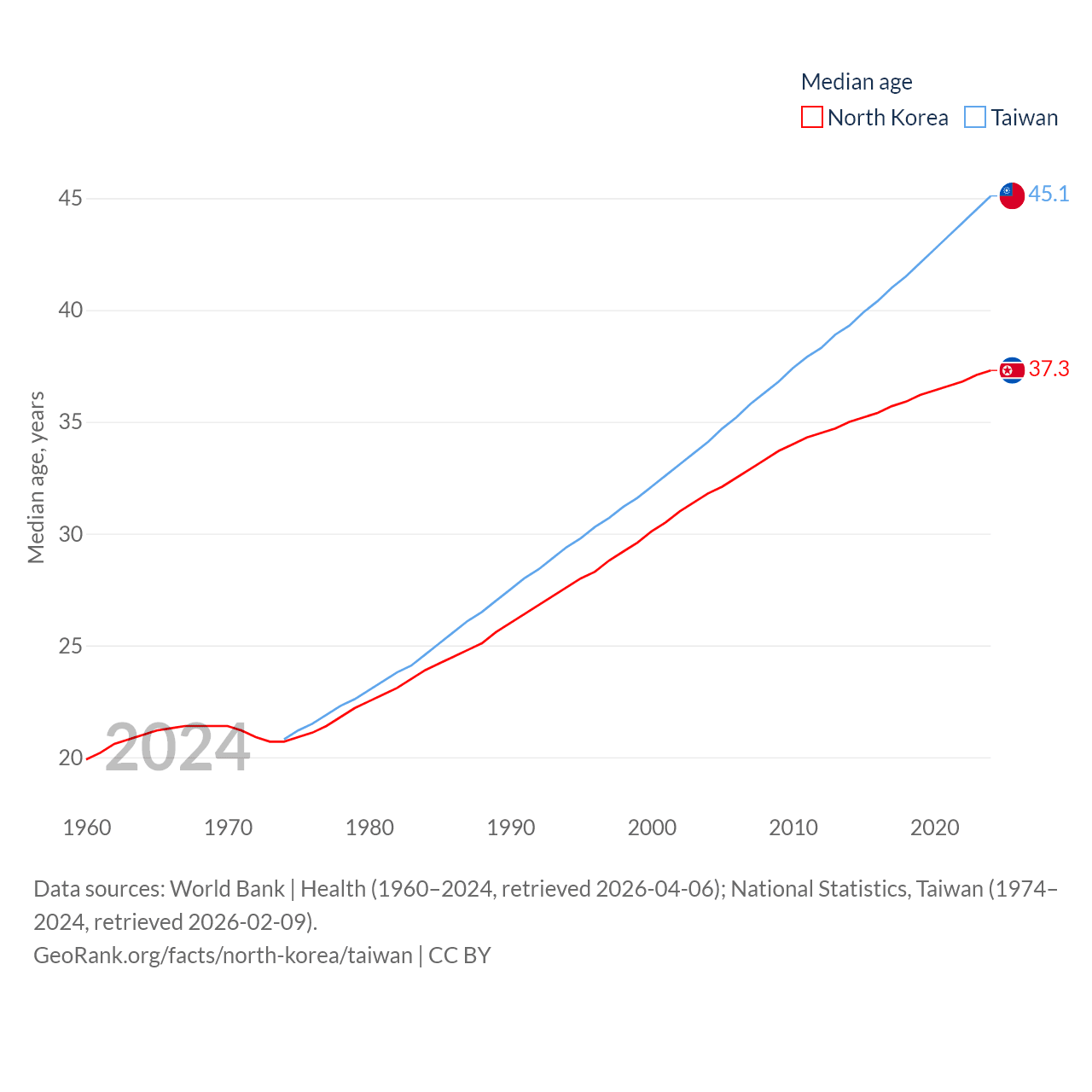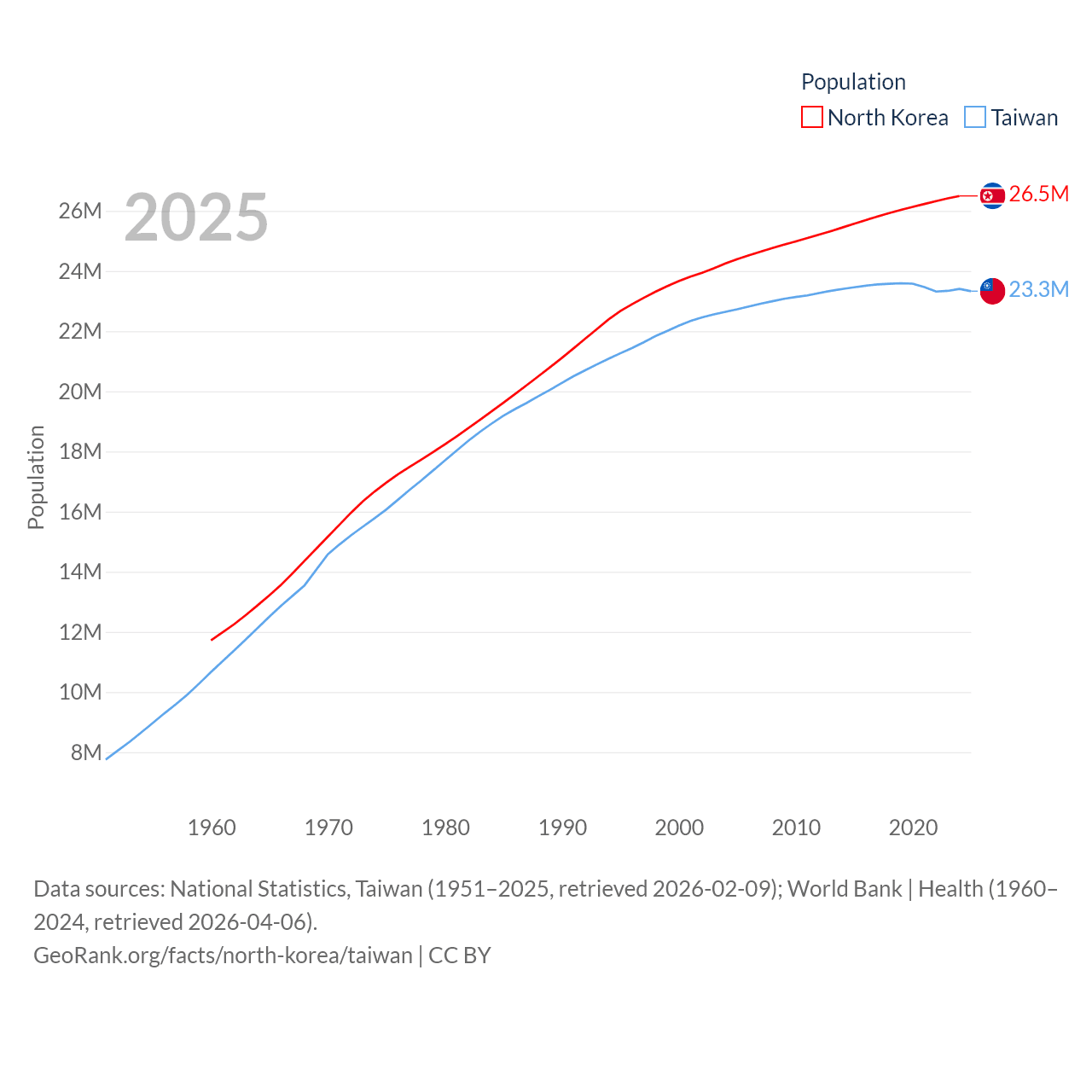 North Korea has a population of 26.5M (ranked 56/197), compared with 23.3M in Taiwan (ranked 60/197). North Korea's land area is 46,491 sq mi versus 13,976 sq mi for Taiwan (ranked 97th vs. 133rd).