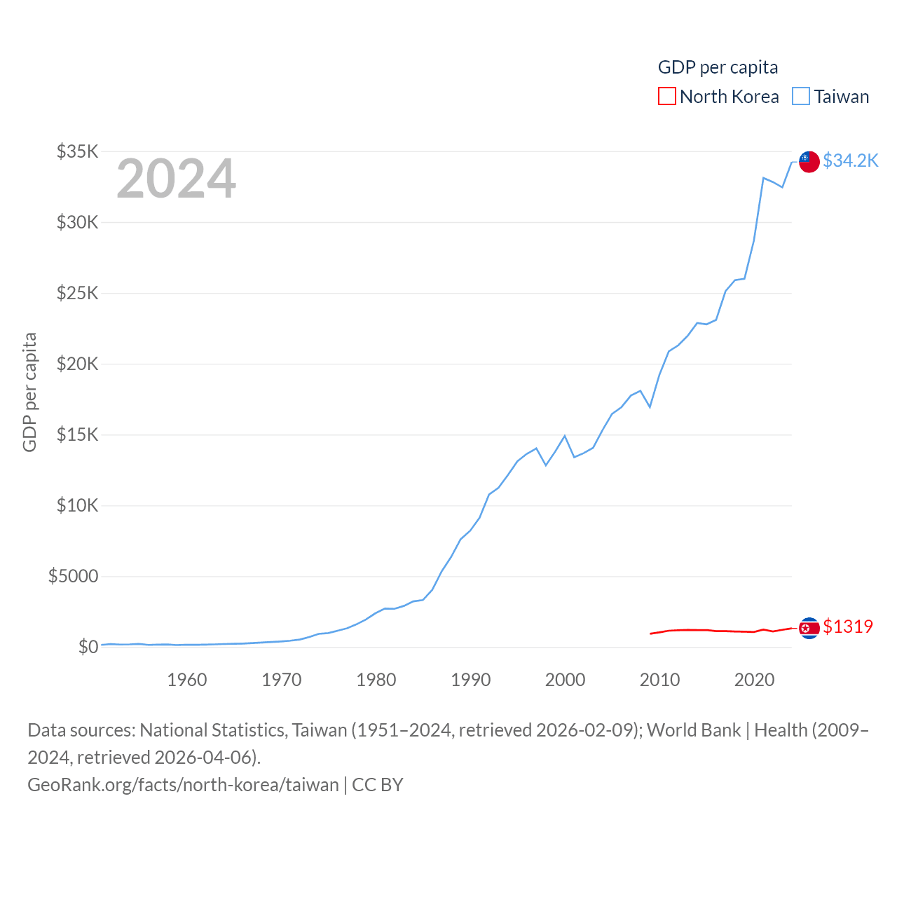 By GDP, North Korea ranks 106/197 ($34.9B) and Taiwan ranks 22/197 ($802B). By GDP per capita, North Korea ranks 168/197 ($1,319), while Taiwan ranks 35/197 ($34,238).