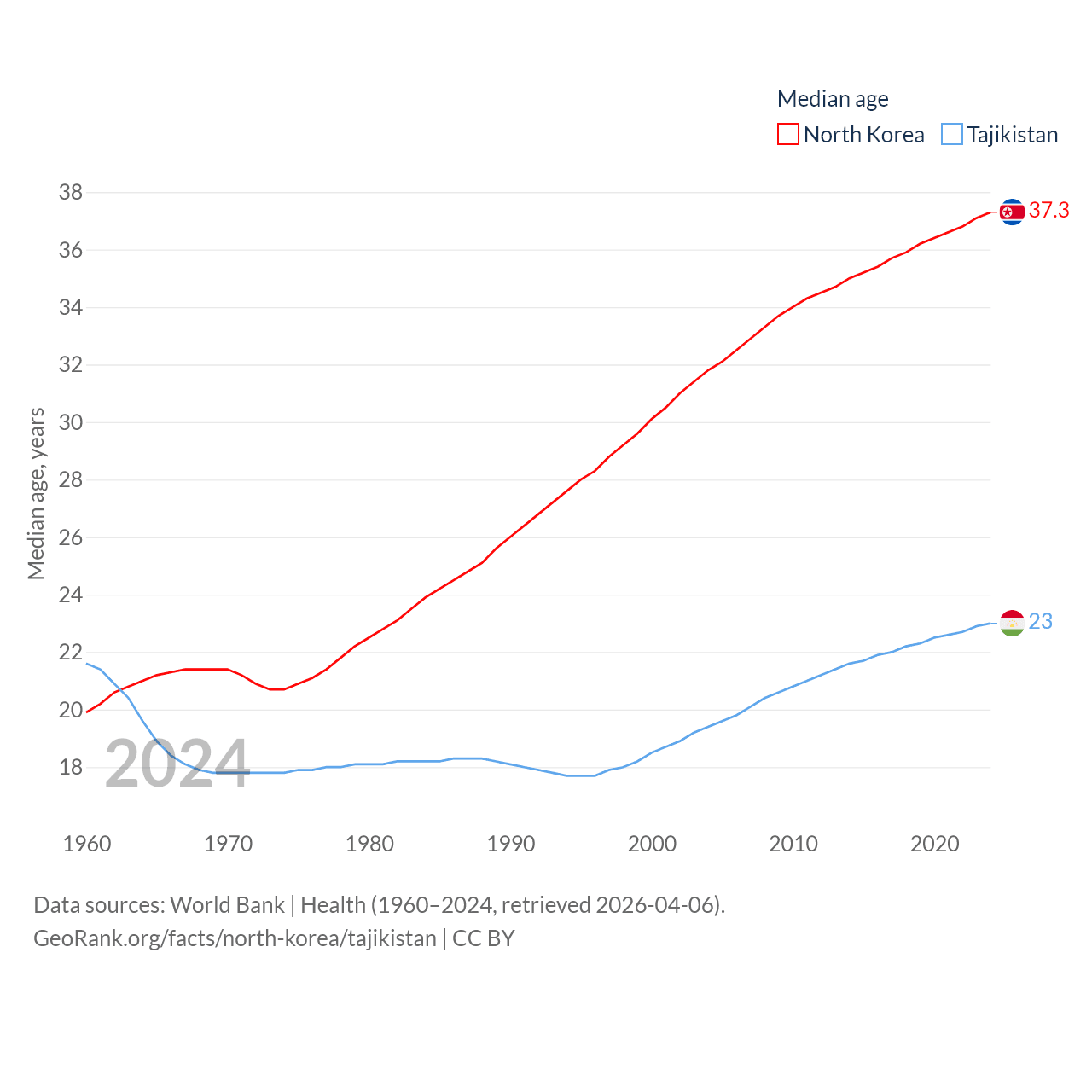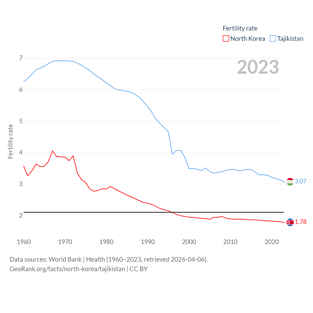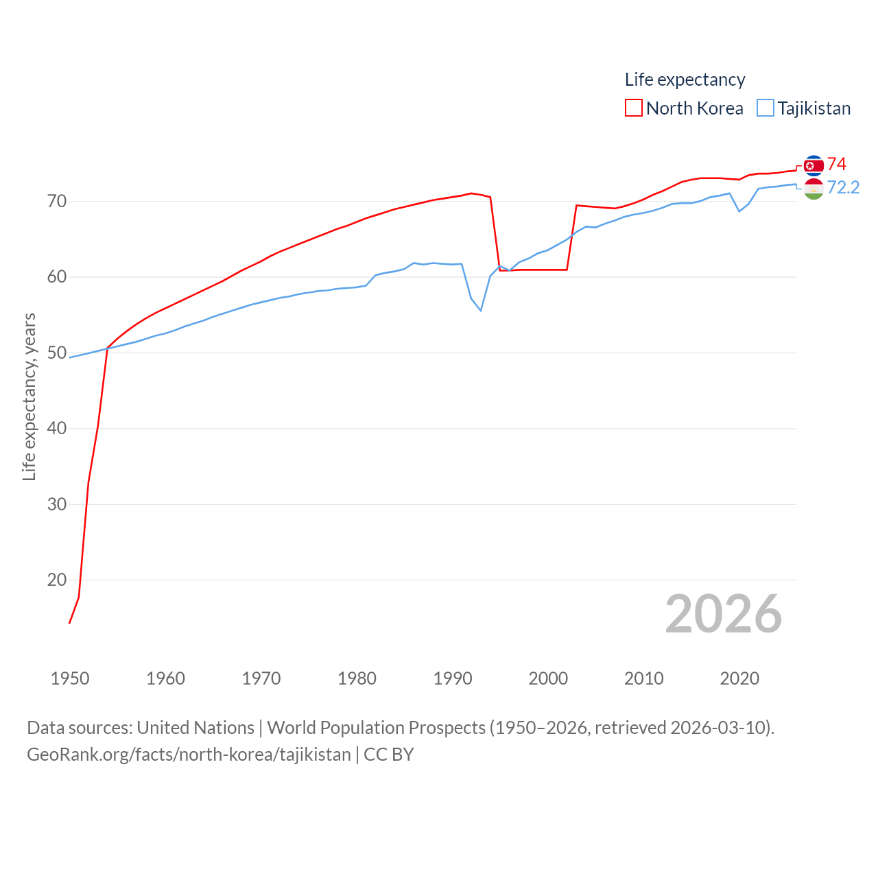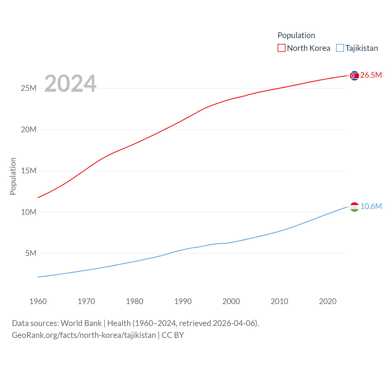 North Korea has a population of 26.5M (ranked 56/197), compared with 10.6M in Tajikistan (ranked 91/197). North Korea's land area is 46,491 sq mi versus 53,587 sq mi for Tajikistan (ranked 97th vs. 93rd).