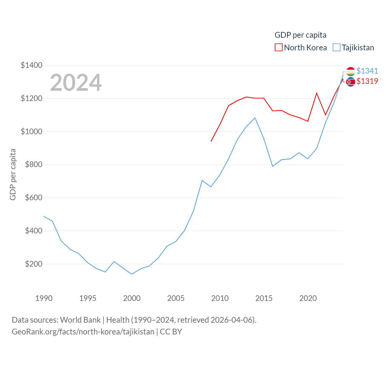 By GDP, North Korea ranks 106/197 ($34.9B) and Tajikistan ranks 145/197 ($14.2B). By GDP per capita, North Korea ranks 168/197 ($1,319), while Tajikistan ranks 166/197 ($1,341).