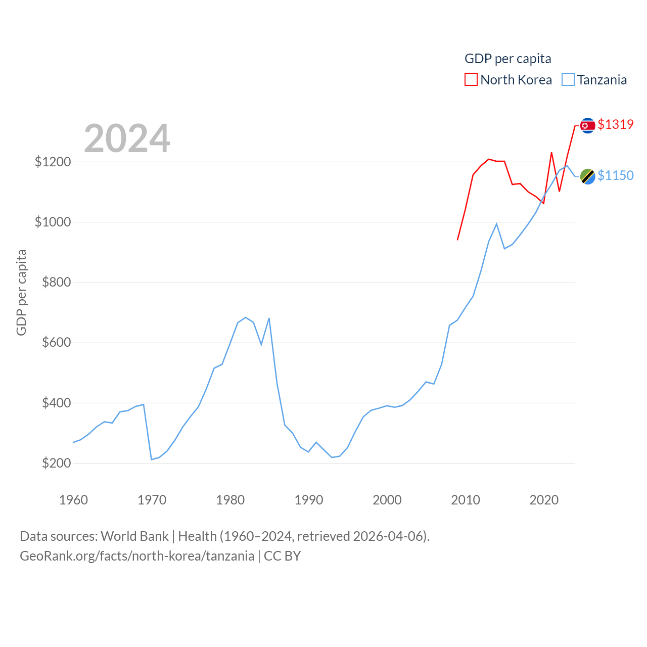 By GDP, North Korea ranks 106/197 ($34.9B) and Tanzania ranks 82/197 ($78.8B). By GDP per capita, North Korea ranks 168/197 ($1,319), while Tanzania ranks 170/197 ($1,150).