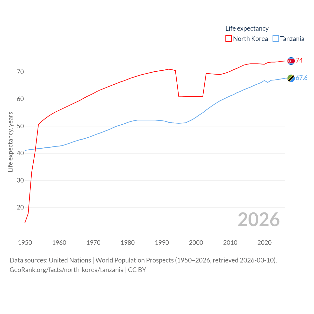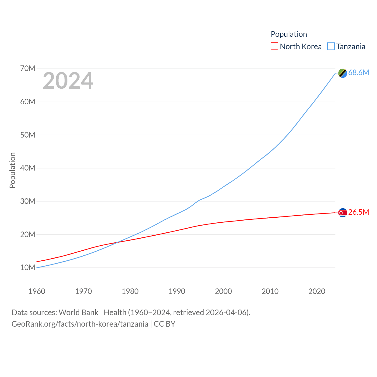 North Korea has a population of 26.5M (ranked 56/197), compared with 68.6M in Tanzania (ranked 22/197). North Korea's land area is 46,491 sq mi versus 342,009 sq mi for Tanzania (ranked 97th vs. 31st).