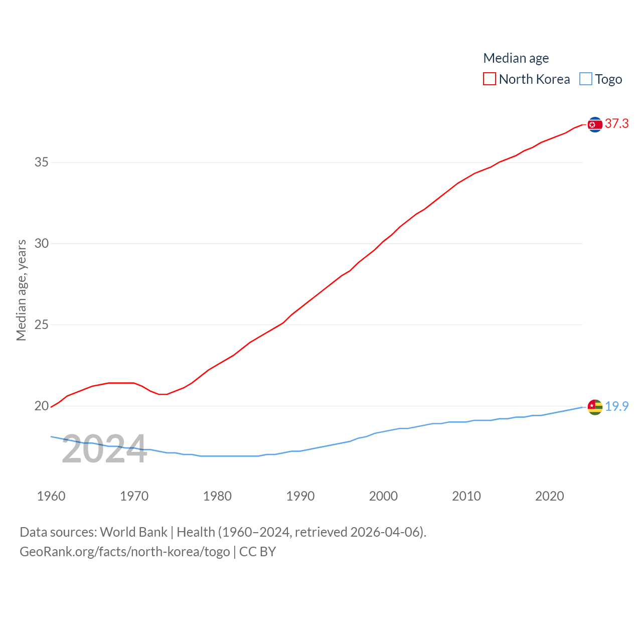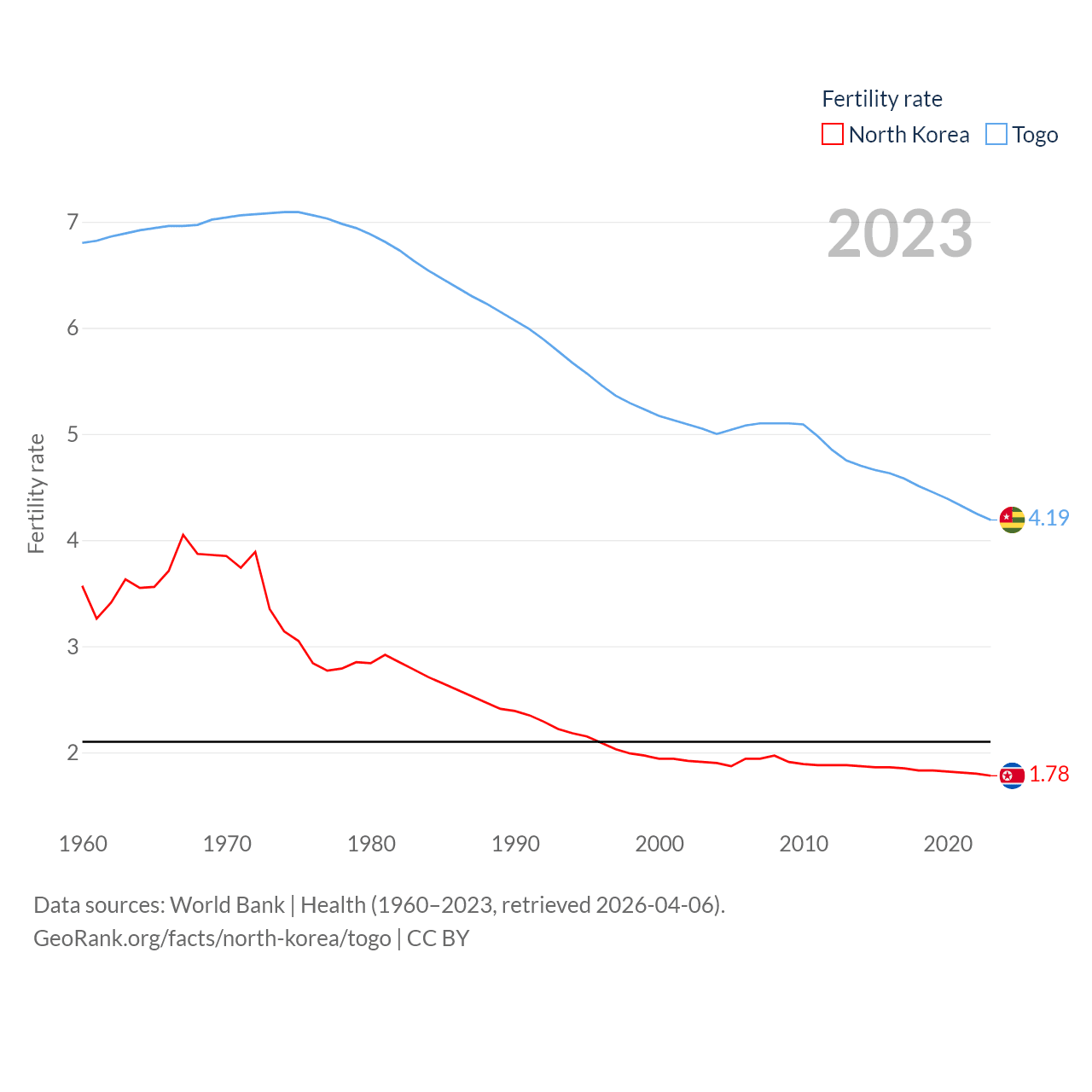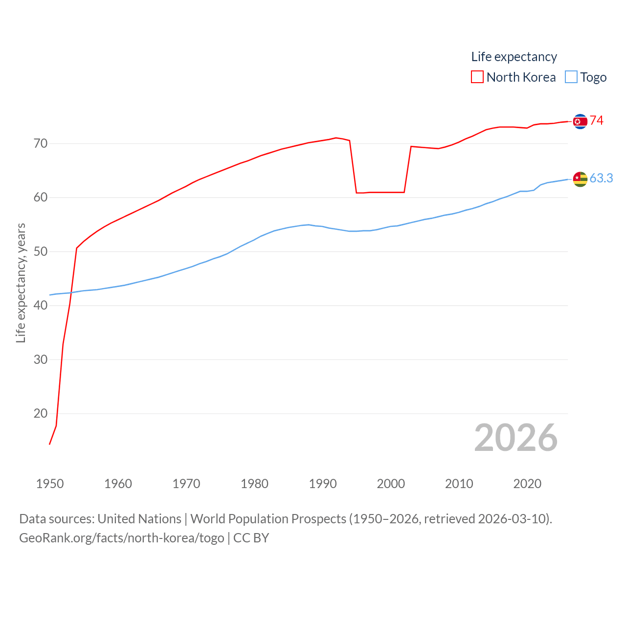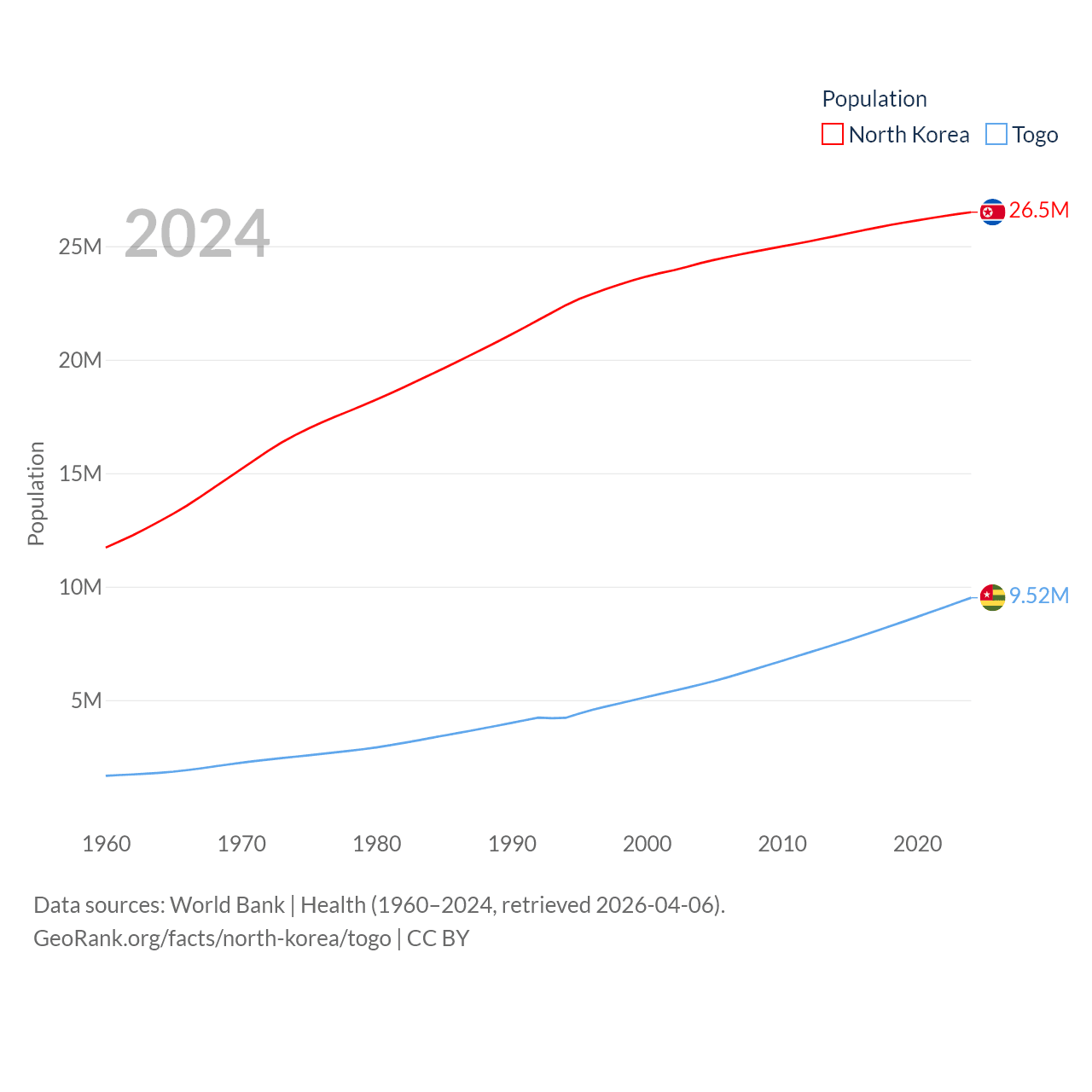North Korea has a population of 26.5M (ranked 56/197), compared with 9.52M in Togo (ranked 98/197). North Korea's land area is 46,491 sq mi versus 21,000 sq mi for Togo (ranked 97th vs. 124th).