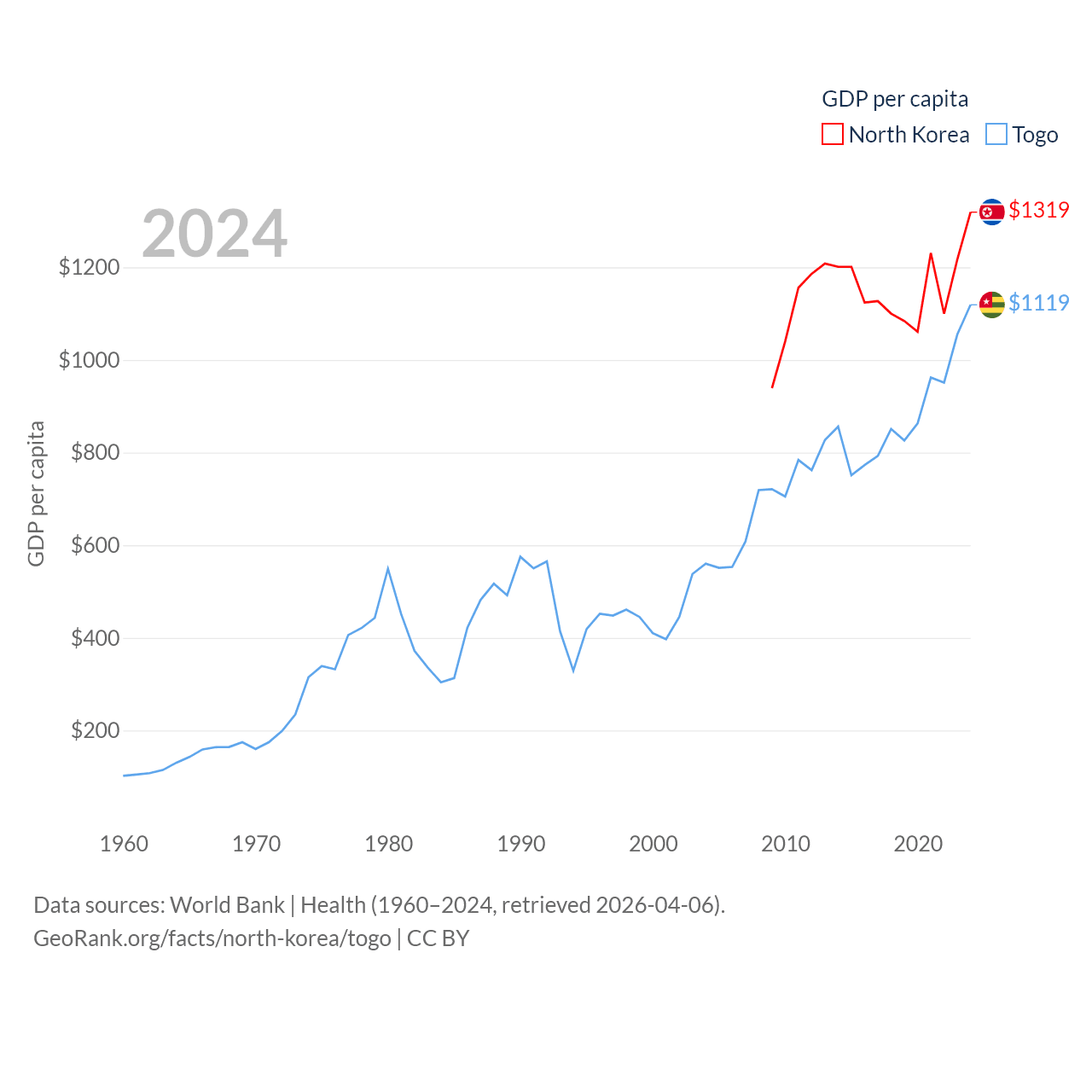 By GDP, North Korea ranks 106/197 ($34.9B) and Togo ranks 154/197 ($10.7B). By GDP per capita, North Korea ranks 168/197 ($1,319), while Togo ranks 172/197 ($1,119).