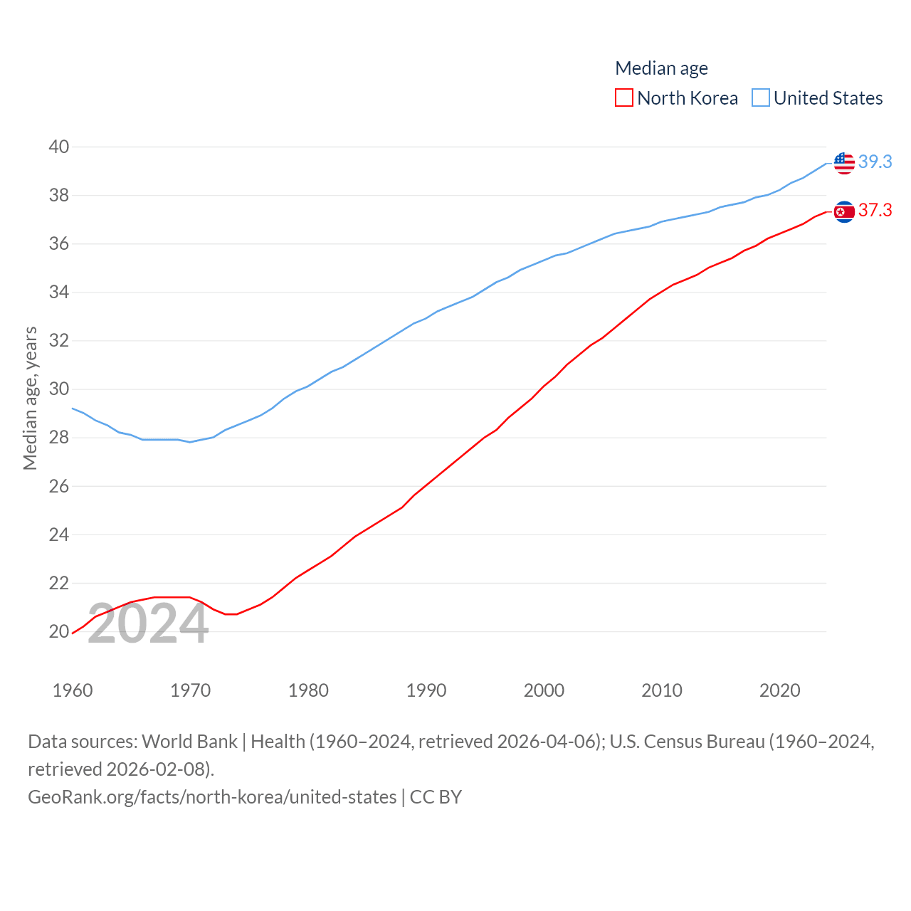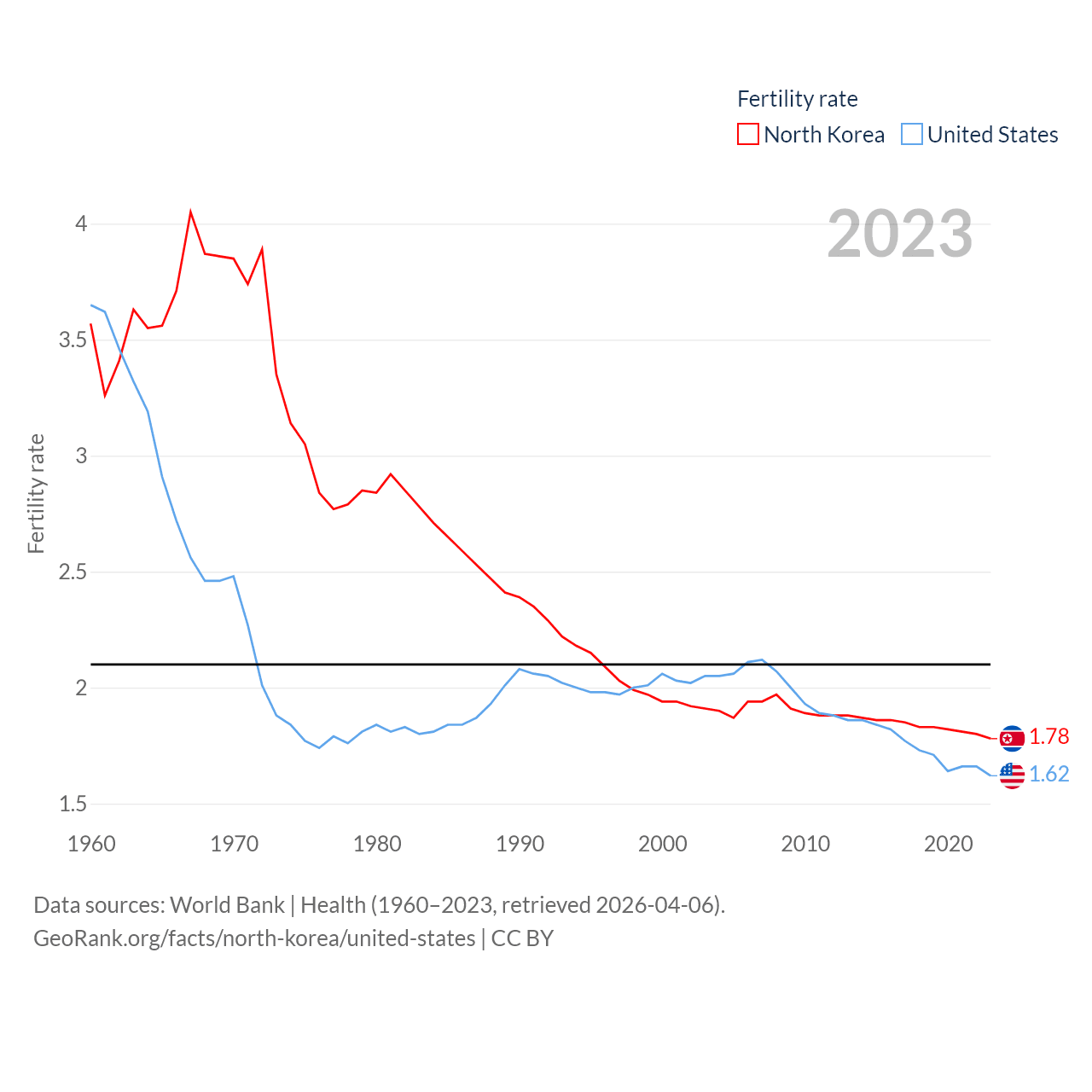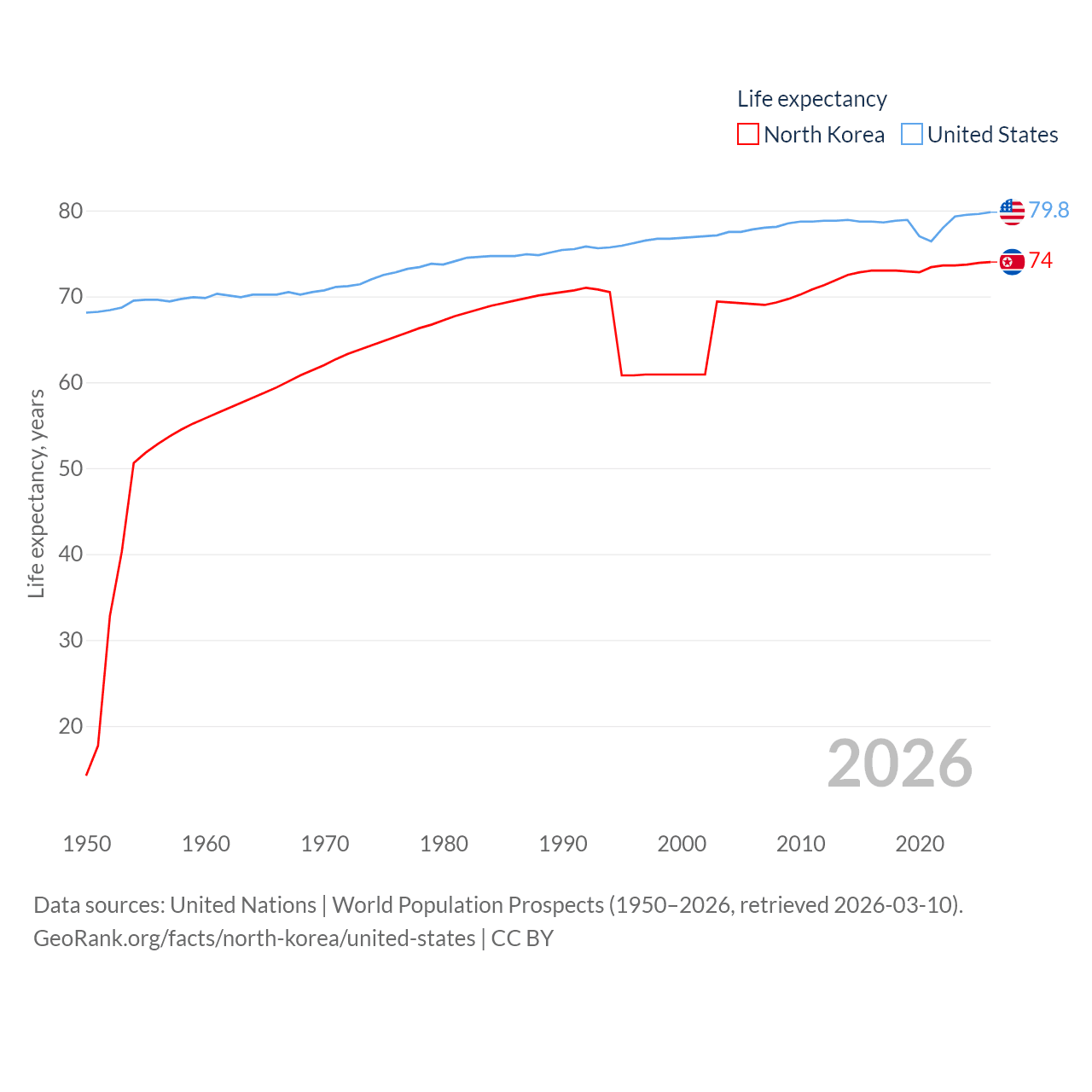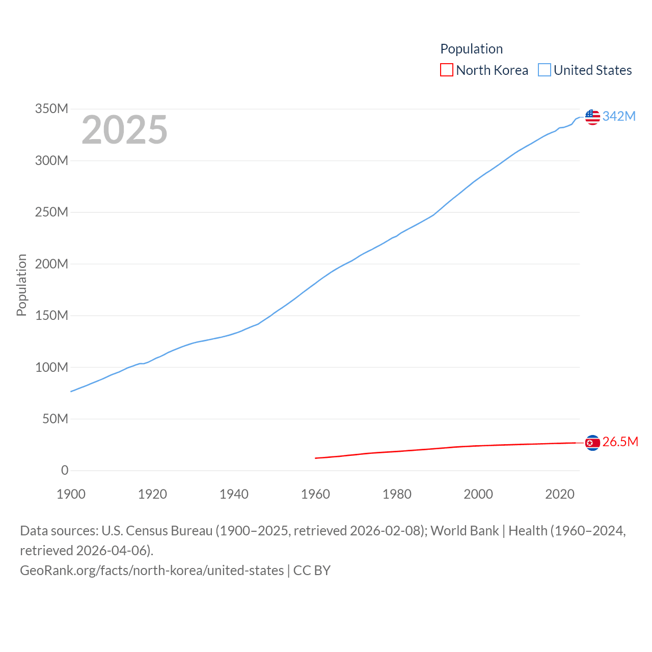 North Korea has a population of 26.5M (ranked 56/197), compared with 342M in The United States (ranked 3/197). North Korea's land area is 46,491 sq mi versus 3,531,839 sq mi for The United States (ranked 97th vs. 3rd).