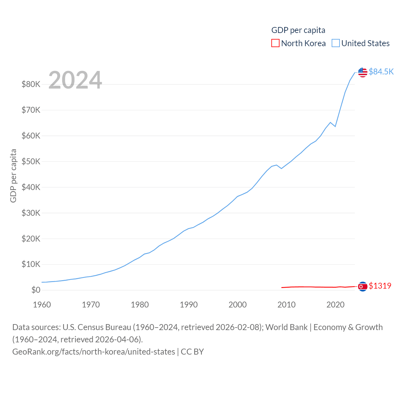 By GDP, North Korea ranks 106/197 ($34.9B) and The United States ranks 1/197 ($28.8T). By GDP per capita, North Korea ranks 168/197 ($1,319), while The United States ranks 10/197 ($84,534).