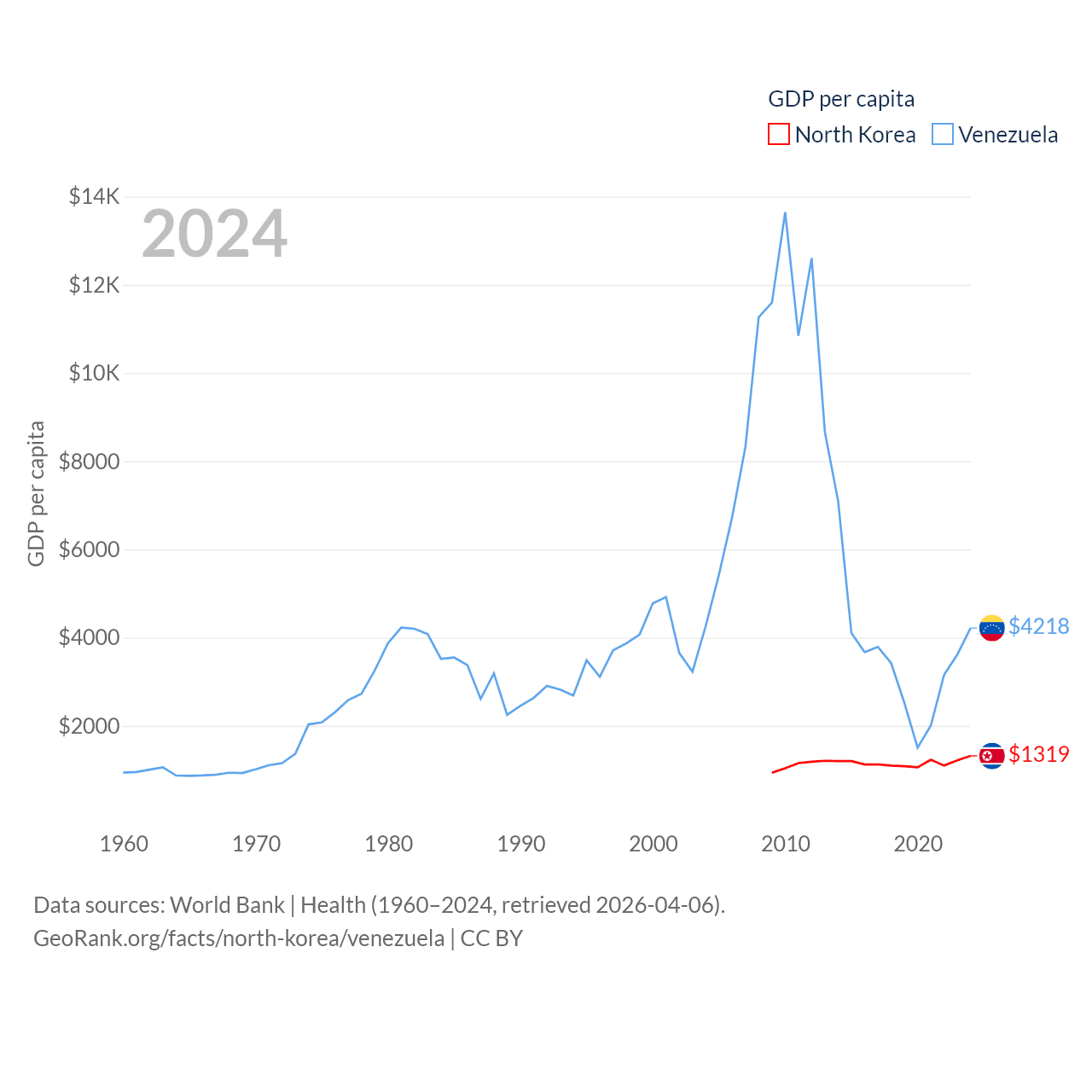 By GDP, North Korea ranks 106/197 ($34.9B) and Venezuela ranks 65/197 ($120B). By GDP per capita, North Korea ranks 168/197 ($1,319), while Venezuela ranks 128/197 ($4,218).