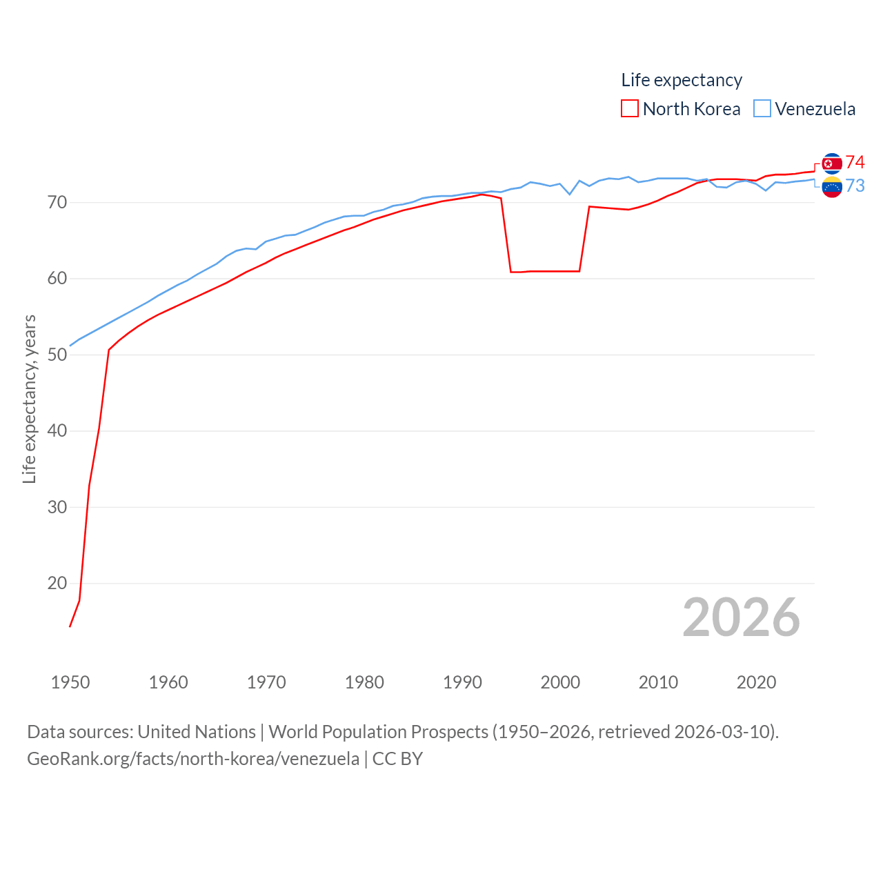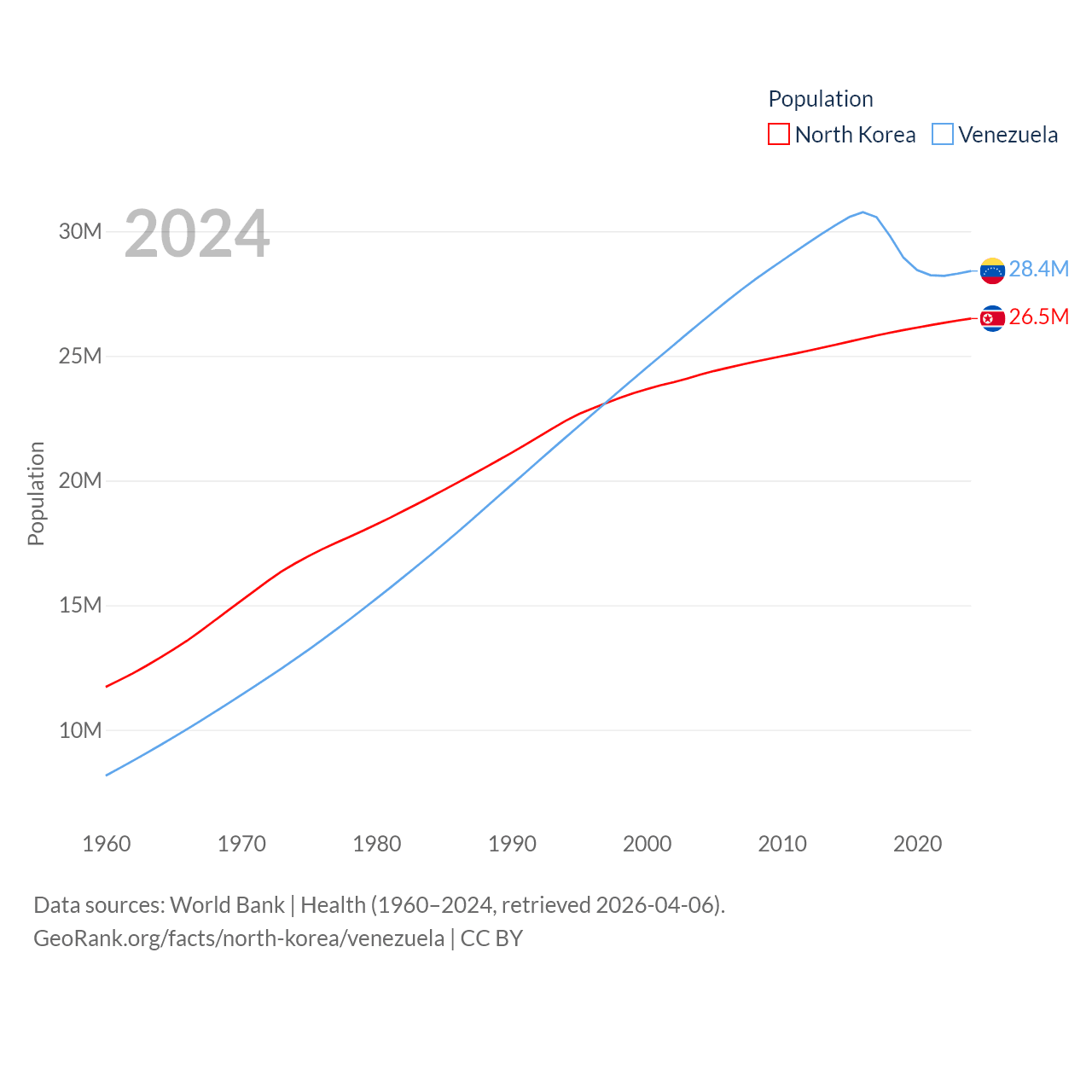 North Korea has a population of 26.5M (ranked 56/197), compared with 28.4M in Venezuela (ranked 53/197). North Korea's land area is 46,491 sq mi versus 340,561 sq mi for Venezuela (ranked 97th vs. 32nd).
