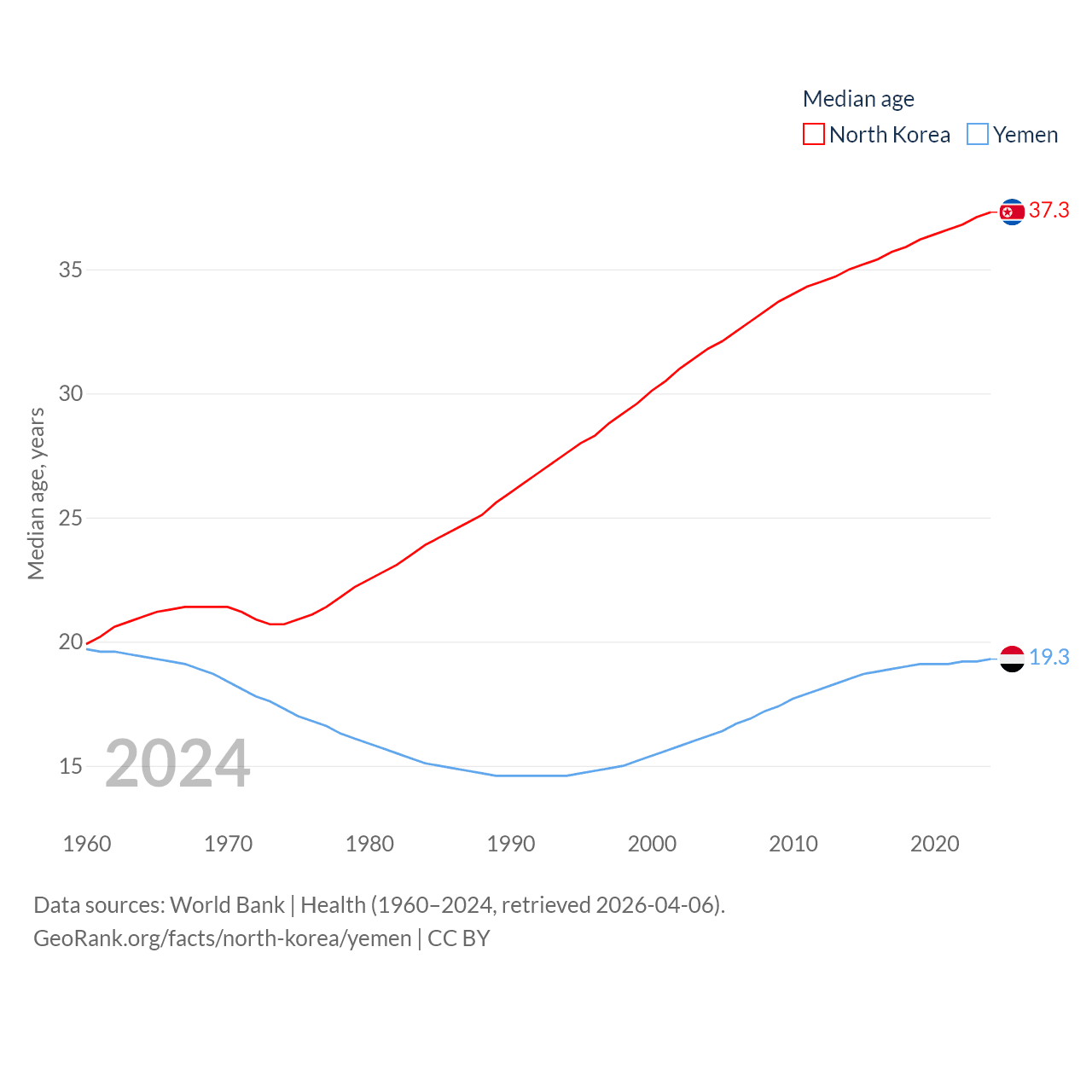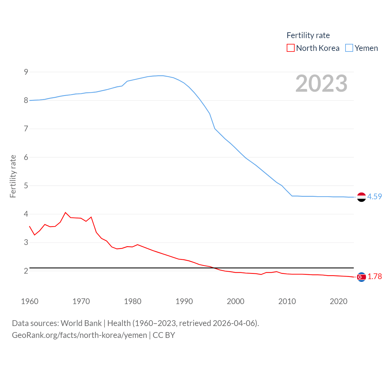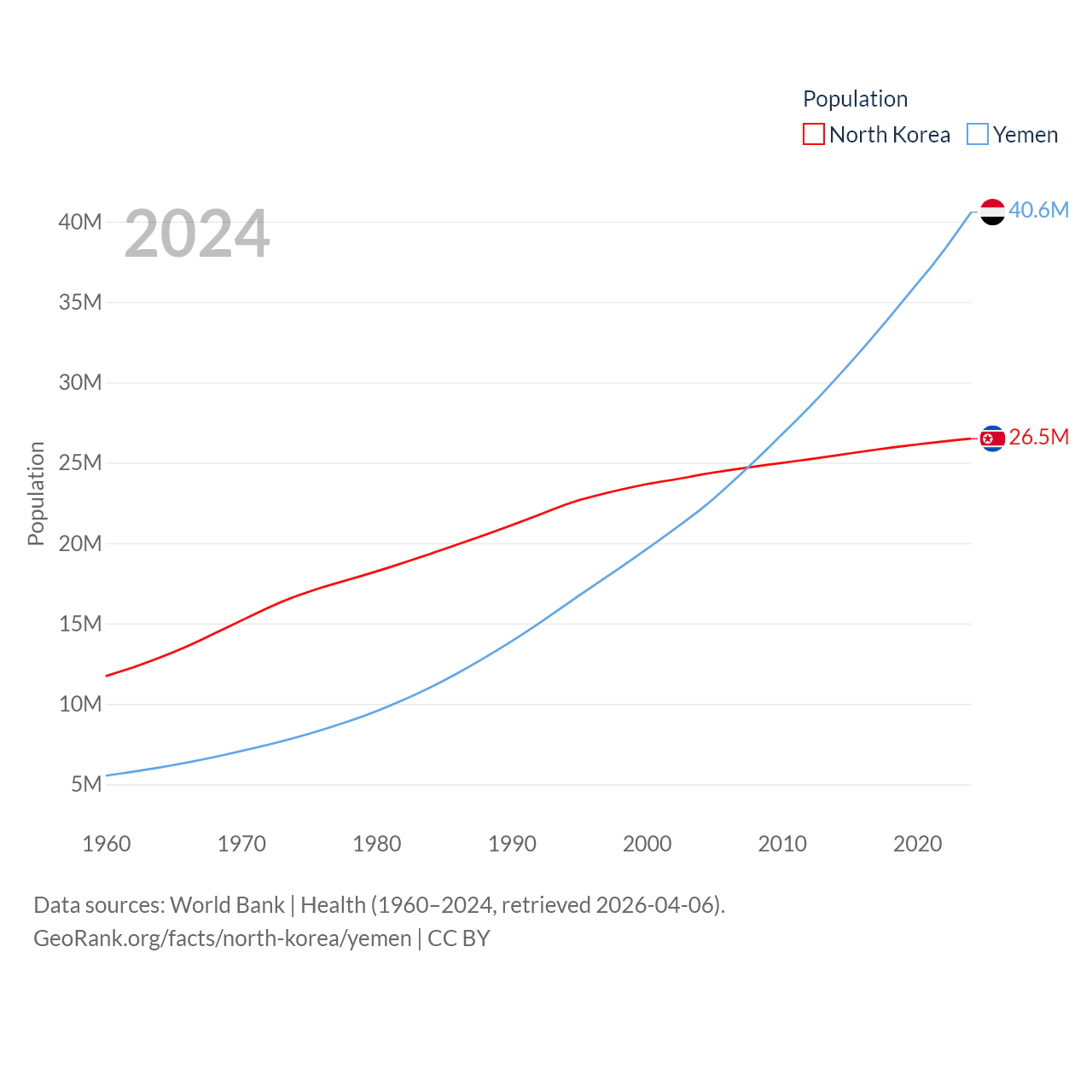 North Korea has a population of 26.5M (ranked 56/197), compared with 40.6M in Yemen (ranked 38/197). North Korea's land area is 46,491 sq mi versus 203,850 sq mi for Yemen (ranked 97th vs. 49th).