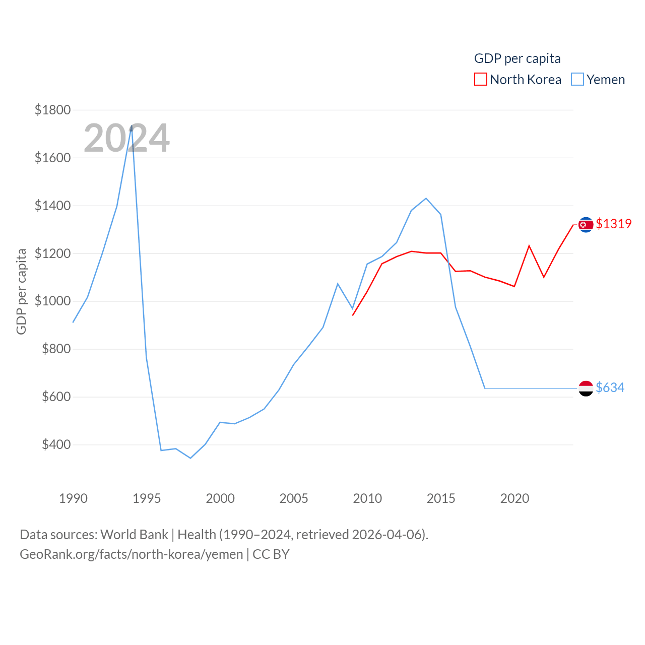 By GDP, North Korea ranks 106/197 ($34.9B) and Yemen ranks 125/197 ($21.6B). By GDP per capita, North Korea ranks 168/197 ($1,319), while Yemen ranks 191/197 ($634).